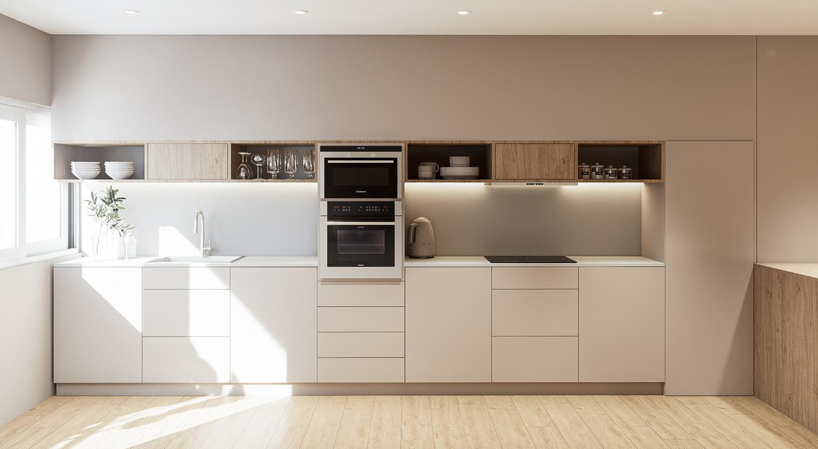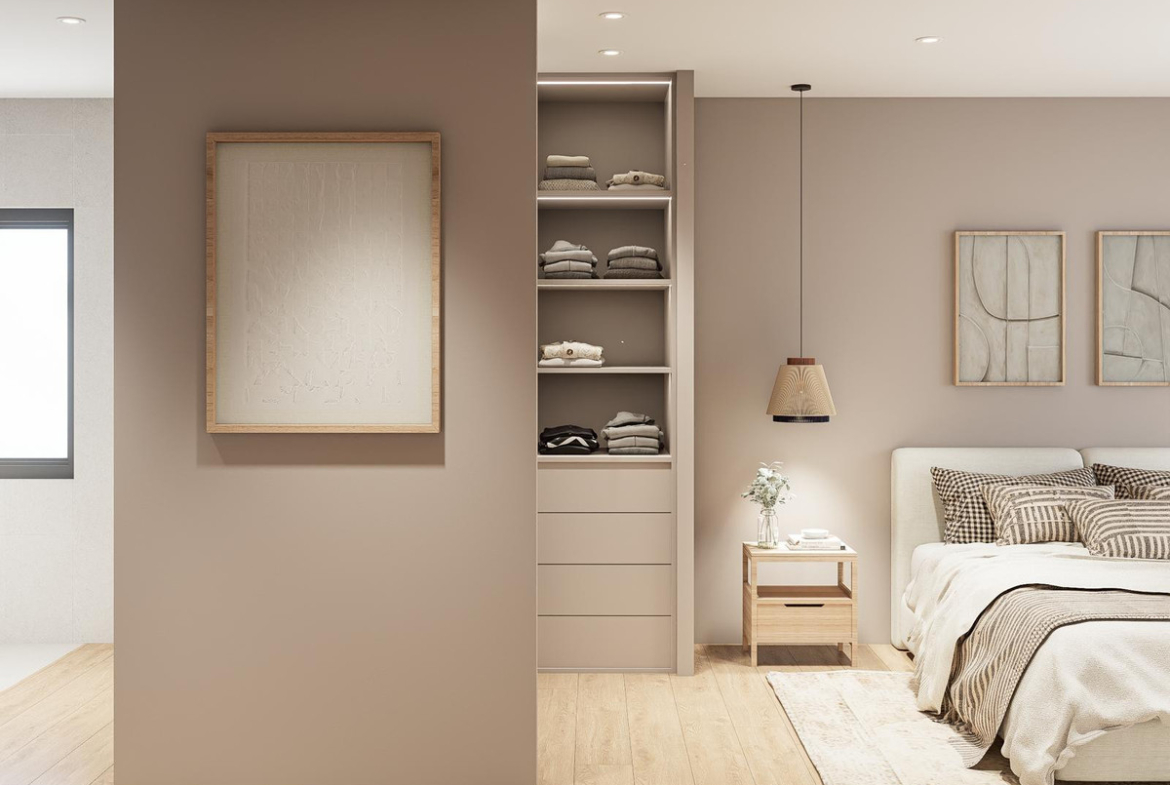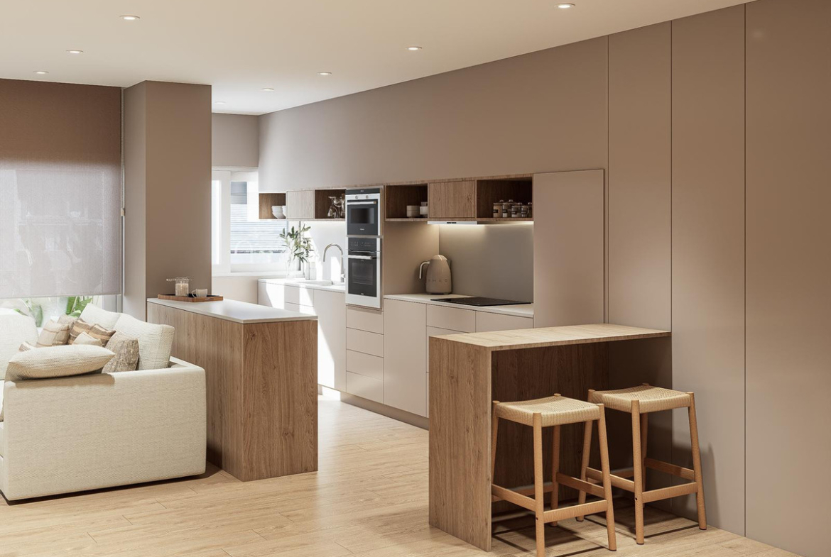 The apartment features two bedrooms, both with built-in wardrobes and modern finishes. The master bedroom has a large private bathroom with a spacious shower, while the second bathroom is also fully equipped and maintains the same contemporary design. Finishes include porcelain flooring in wet areas and double glazing on all windows, ensuring comfort and efficiency.