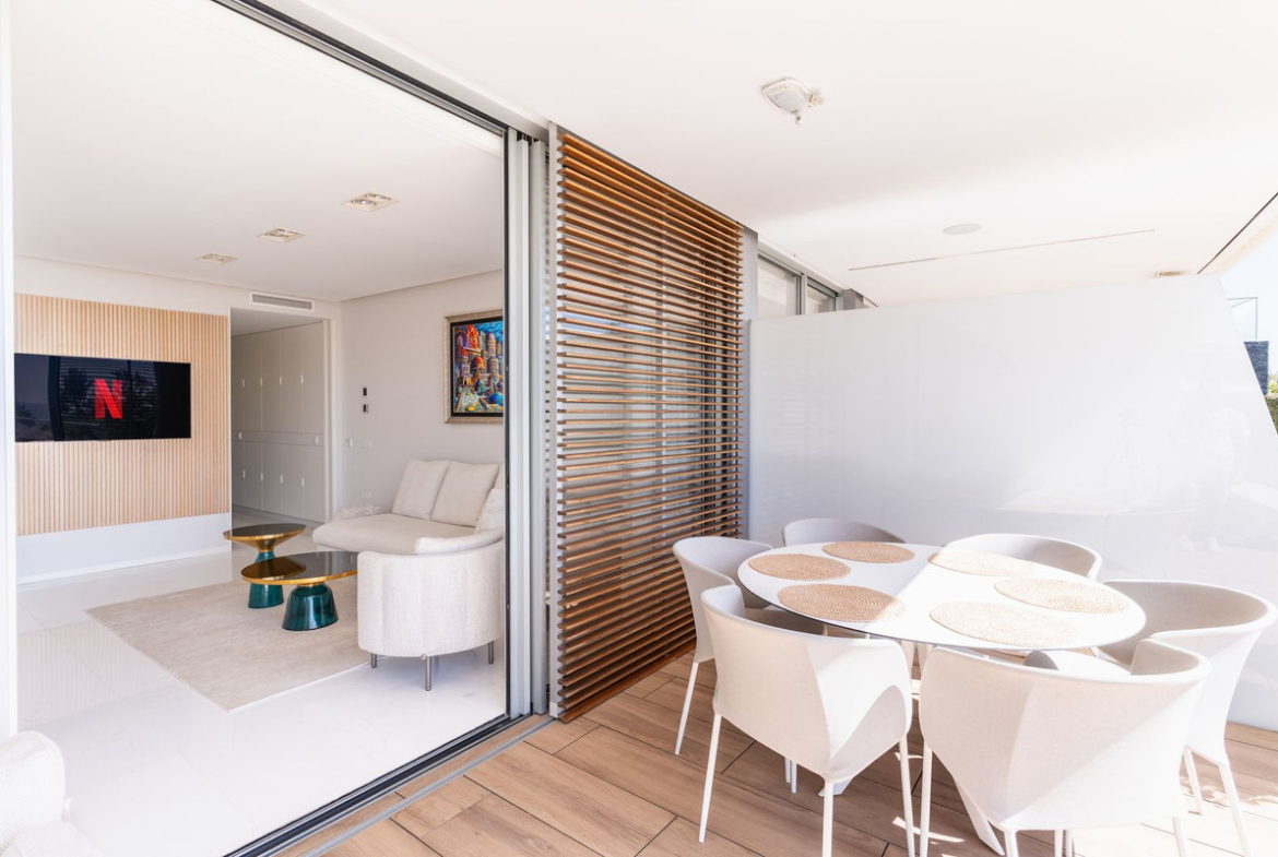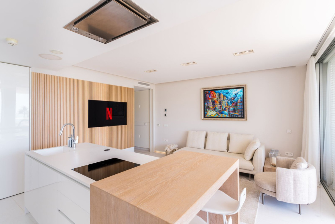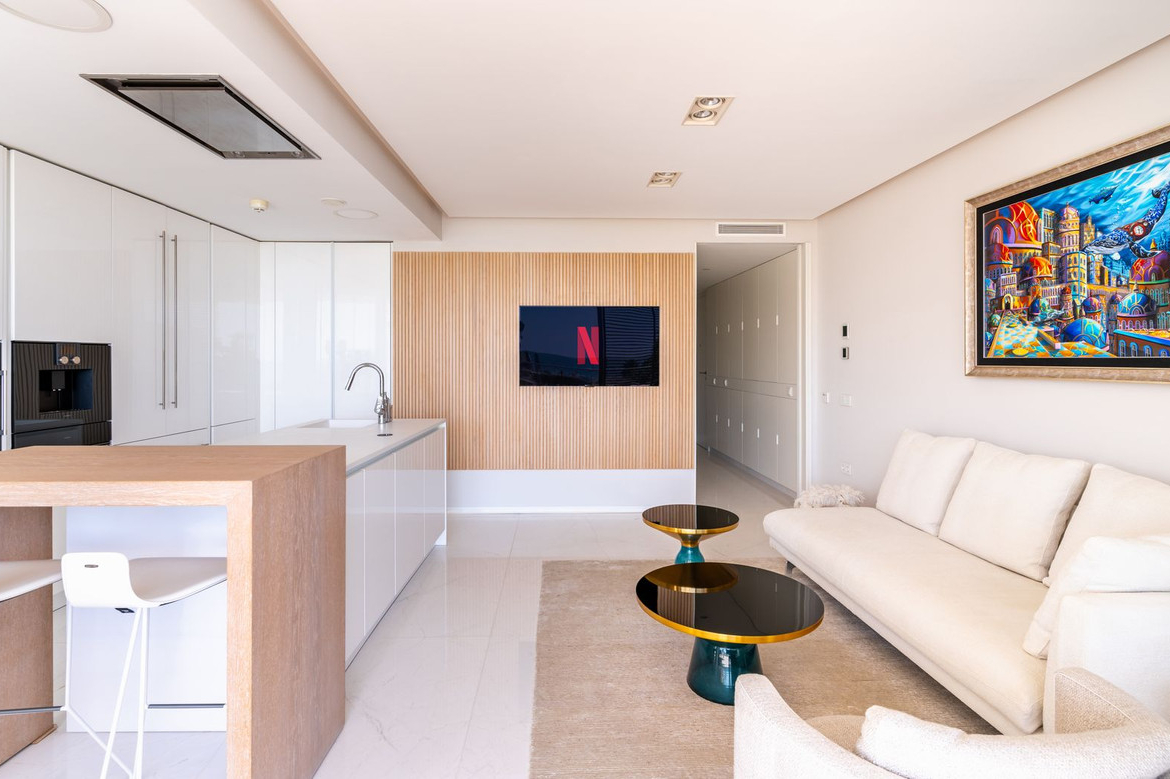 Kitchen is fully equipped with Gaggenau appliance with double fridge and freezer with ice maker, coffee maschine and warming drawer, ideal for preparing family meals in elegant space. The kitchen area is integrated with the living area. The floor-to-ceiling glass doors gives the bright and lead to the into a generous over 32 m2 terrace and private use garden. Here you can enjoy spectacular sea views. The apartment was designed with great attention to detail and the highest quality of finish, all rooms have LED lighting installed in the ceilings, in the living room there are additional LED floor strips with division into zones and dimmers in all rooms allowing to create a unique atmosphere in the evening.