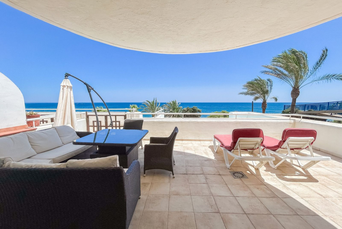 The standout feature of this property is the expansive terrace with incredible first-line beach views. This outdoor space is perfect for dining al fresco, sunbathing, or simply relaxing while enjoying the sights and sounds of the sea just steps away.