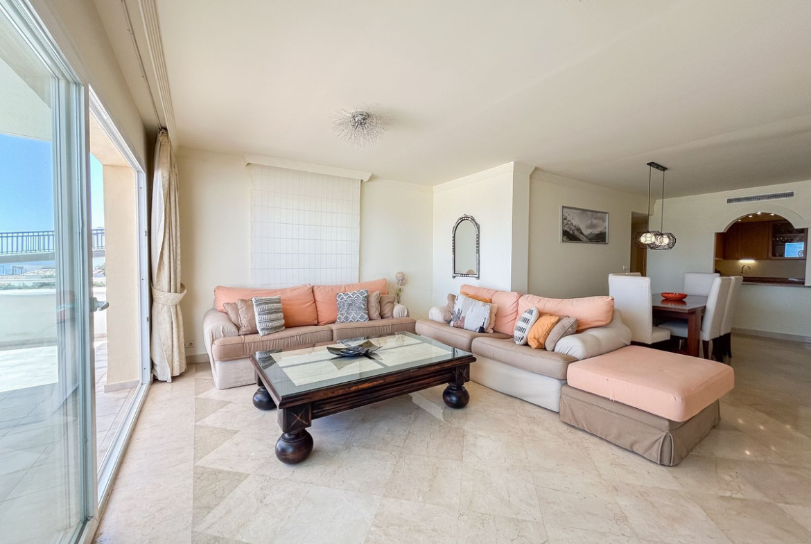 The apartment’s interior is bright and inviting, with an open-plan living and dining area that seamlessly connects to a generous private terrace. Large windows and sliding doors fill the space with natural light and frame beautiful views of the coastline and sea, creating a relaxing atmosphere throughout the home. The kitchen is practical and well laid out, suitable for both daily living and entertaining guests.