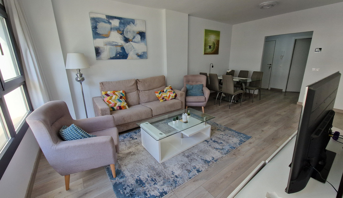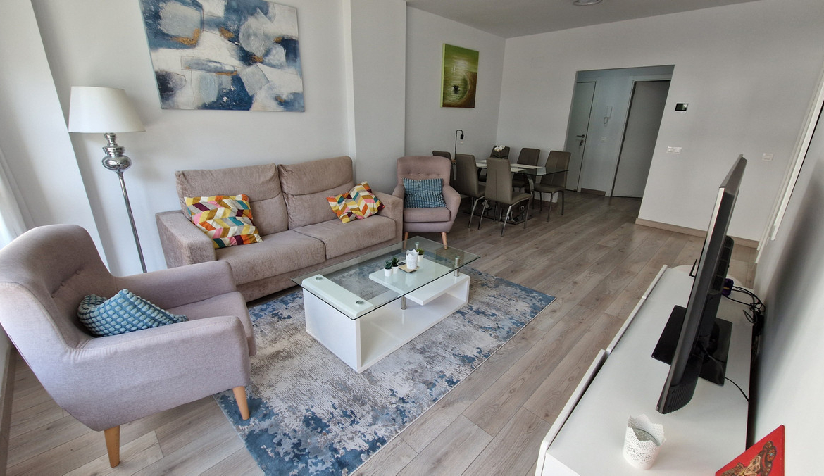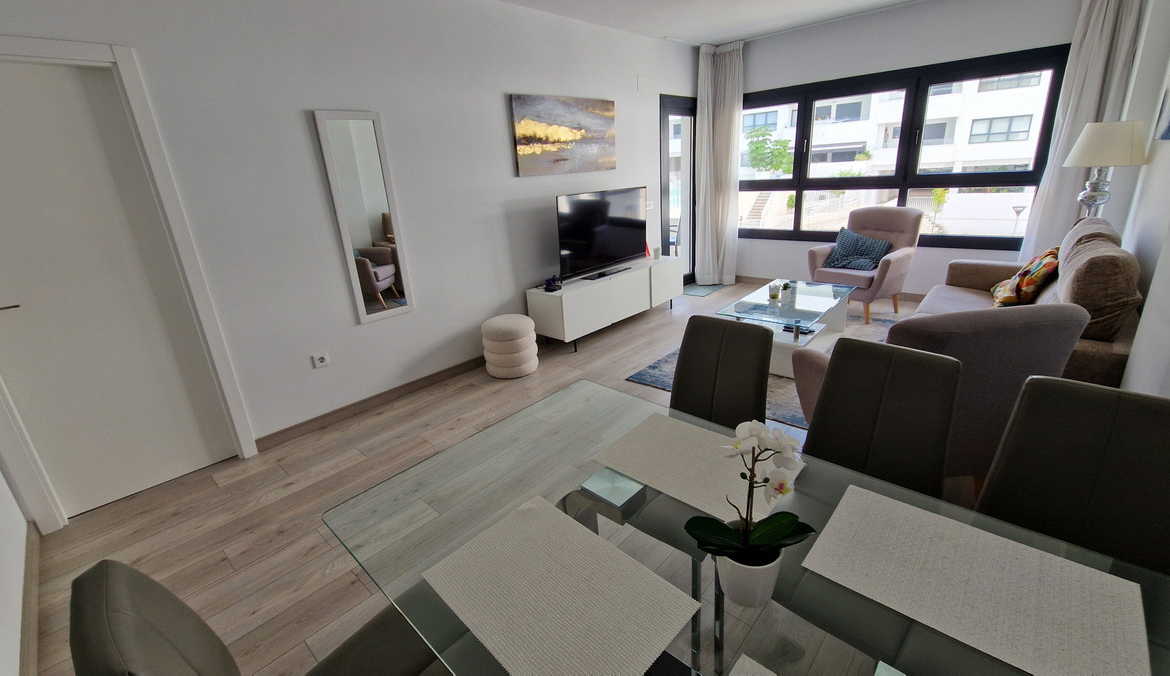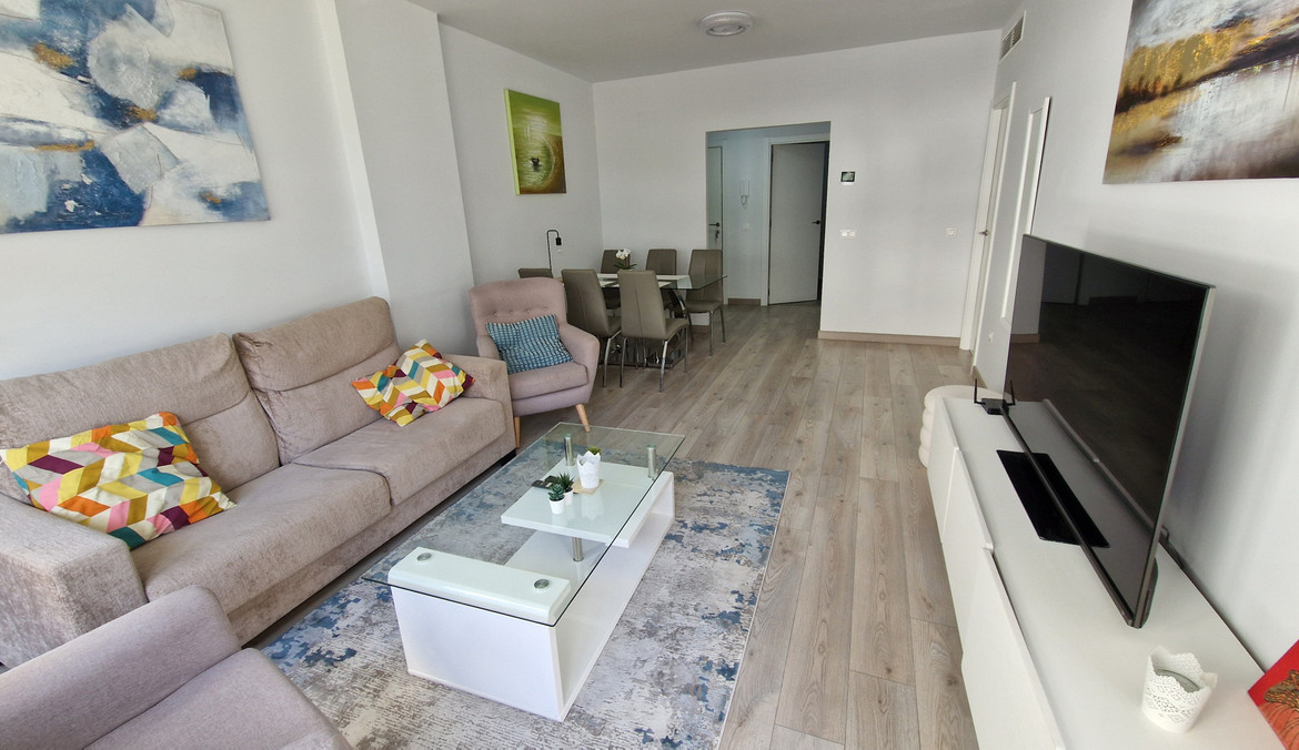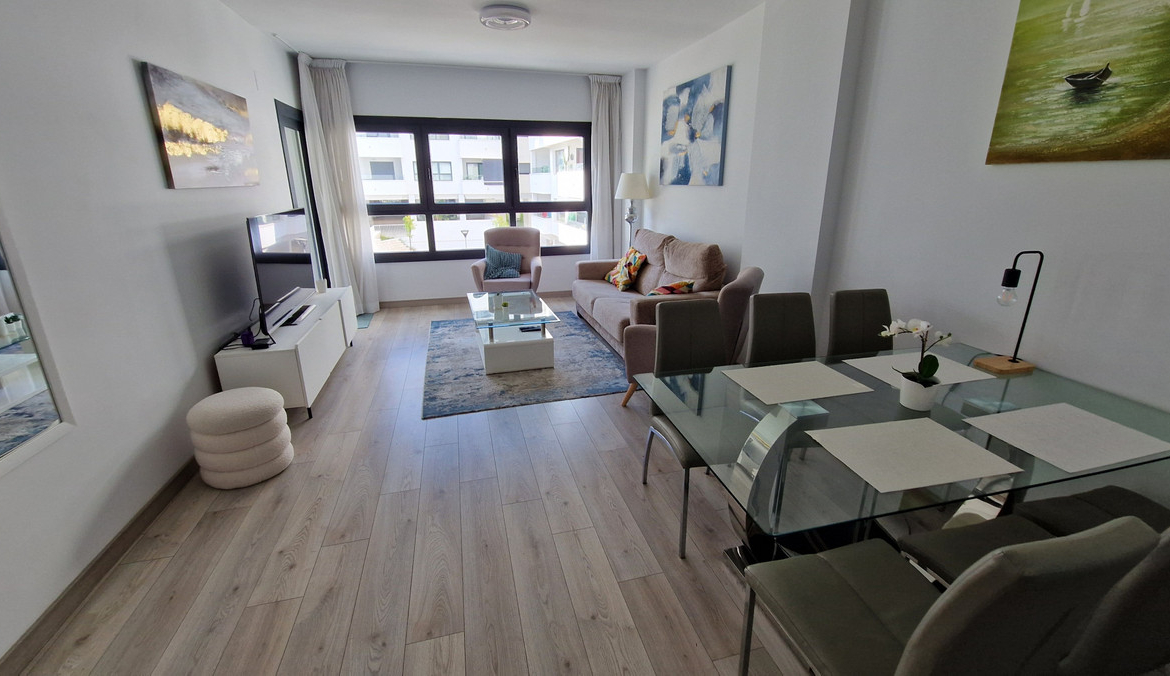 Some of the features include the fitted kitchen and utility room, with all the appliances, air-conditioning hot/cold, solar panels on the roof for hot wáter and full WiFi coverage, amongst others. This first floor apartment is accessible with own key access through secure gates with internal intercom, via lift and stairs. The complex has extensive communal areas and gardens, including a large swimming pool, playground for children, and an outdoor gym.