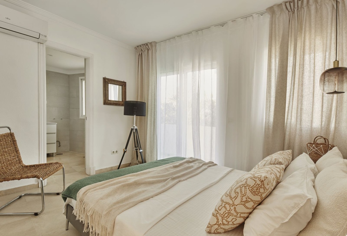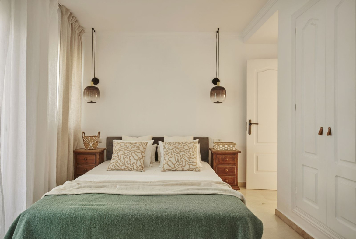 The apartment itself is a two-bedroom unit with a spacious living room and a terrace facing south, overlooking the lovely gardens where you can hear birds singing. The urbanization is stylish, Andalusian, and very well-maintained.