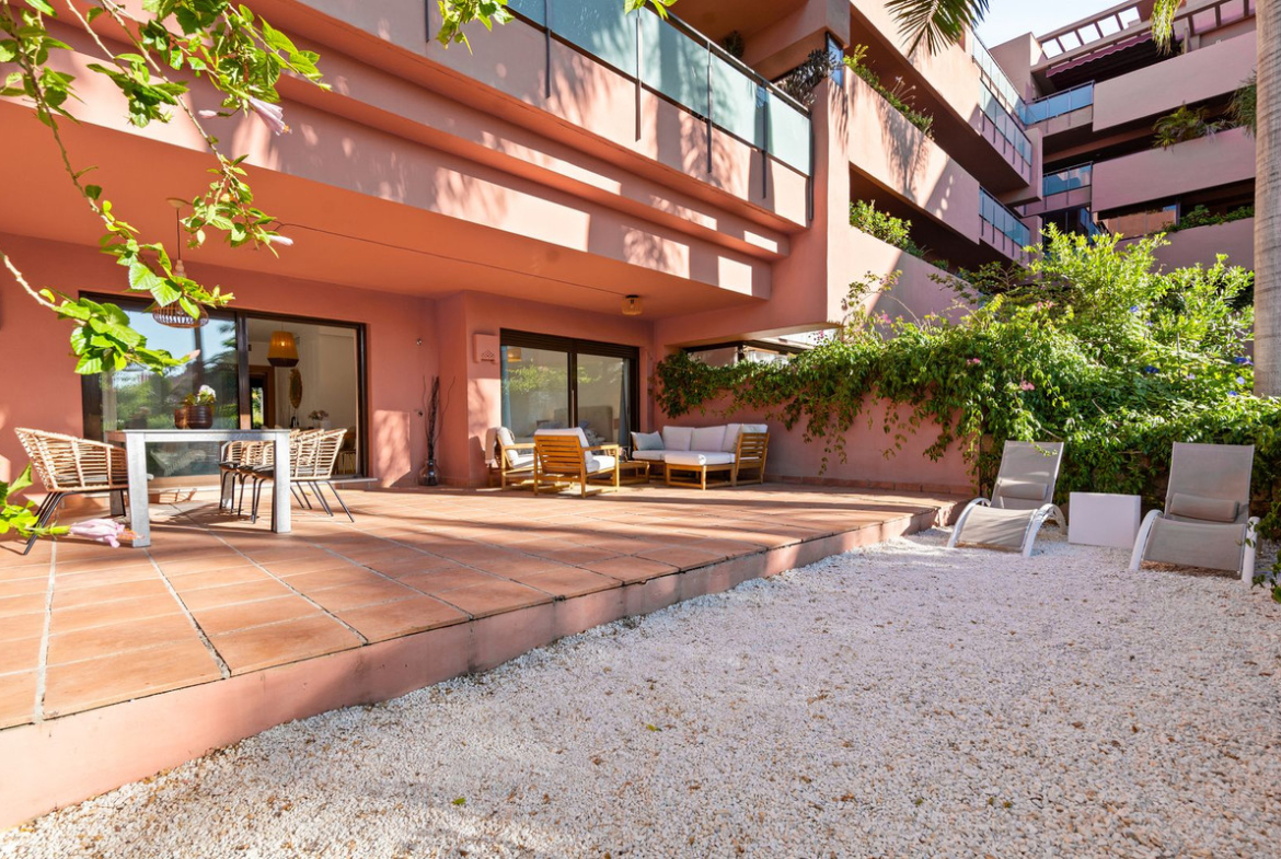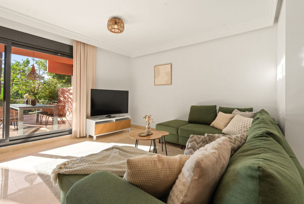 Discover the perfect coastal retreat in this spacious ground floor apartment located on the sought-after New Golden Mile, just a stone's throw from the beach(100 meters). With a generous total area of 163 m², this property features two well-appointed double bedrooms and two large bathrooms, making it ideal for families or those seeking extra space. The exquisite living and dining room opens to two semi-covered terraces, perfect for enjoying the Mediterranean climate.