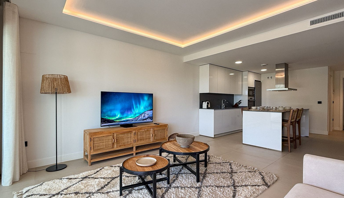 Offering 2 bedrooms and 2 bathrooms. The main bedroom has an open plan bathroom with walk-in shower, anti-fog mirrors, electric towel racks and extra wardrobes. A fully equipped and open plan kitchen with all Bosch appliances and spacious living dining area.