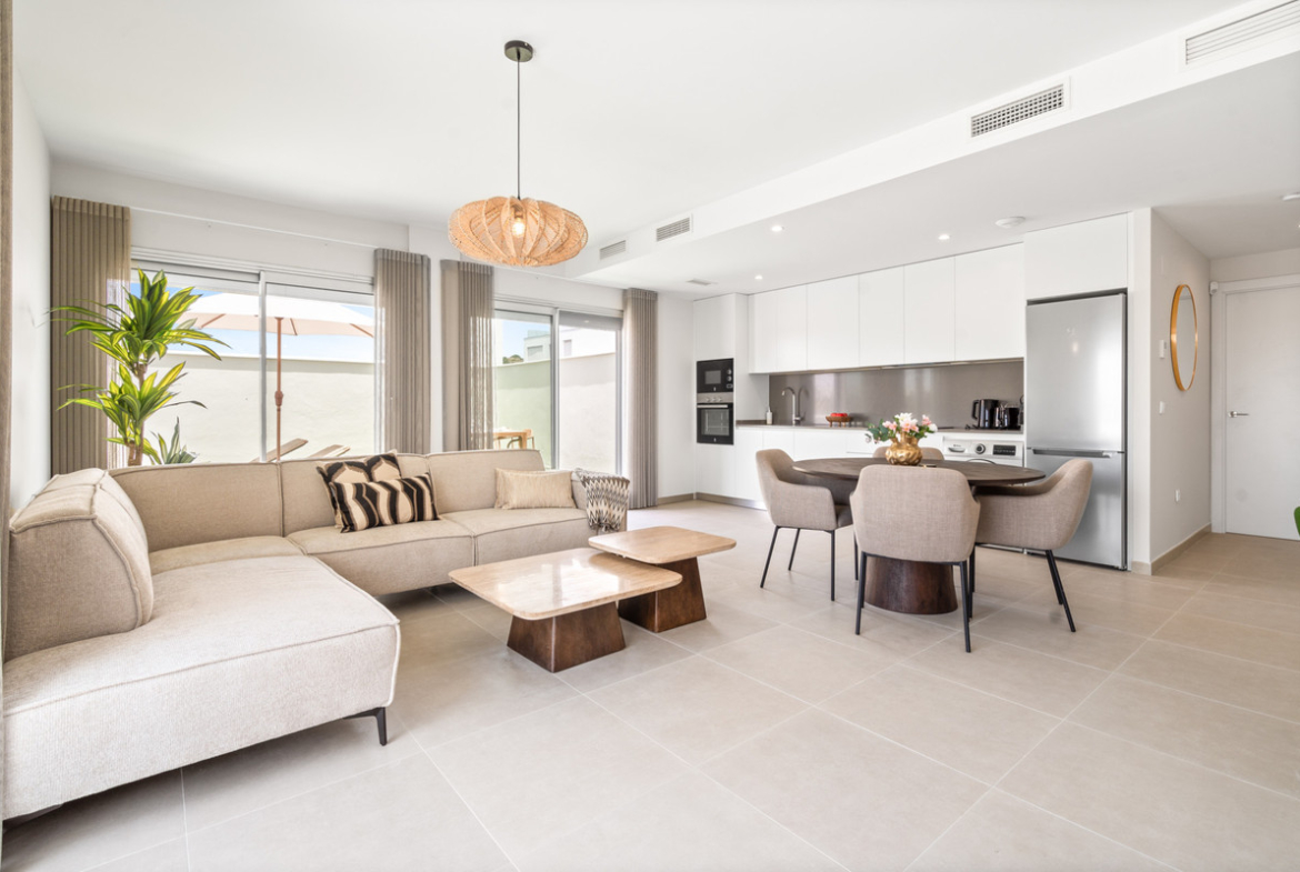 The interior is spacious and light-filled, with a modern open-plan living and dining area that connects effortlessly with the outdoor space. The fully furnished property is delivered turnkey, ready to move in and enjoy immediately. The kitchen is fully equipped with high-end appliances, and both bedrooms feature built-in wardrobes and elegant bathrooms.