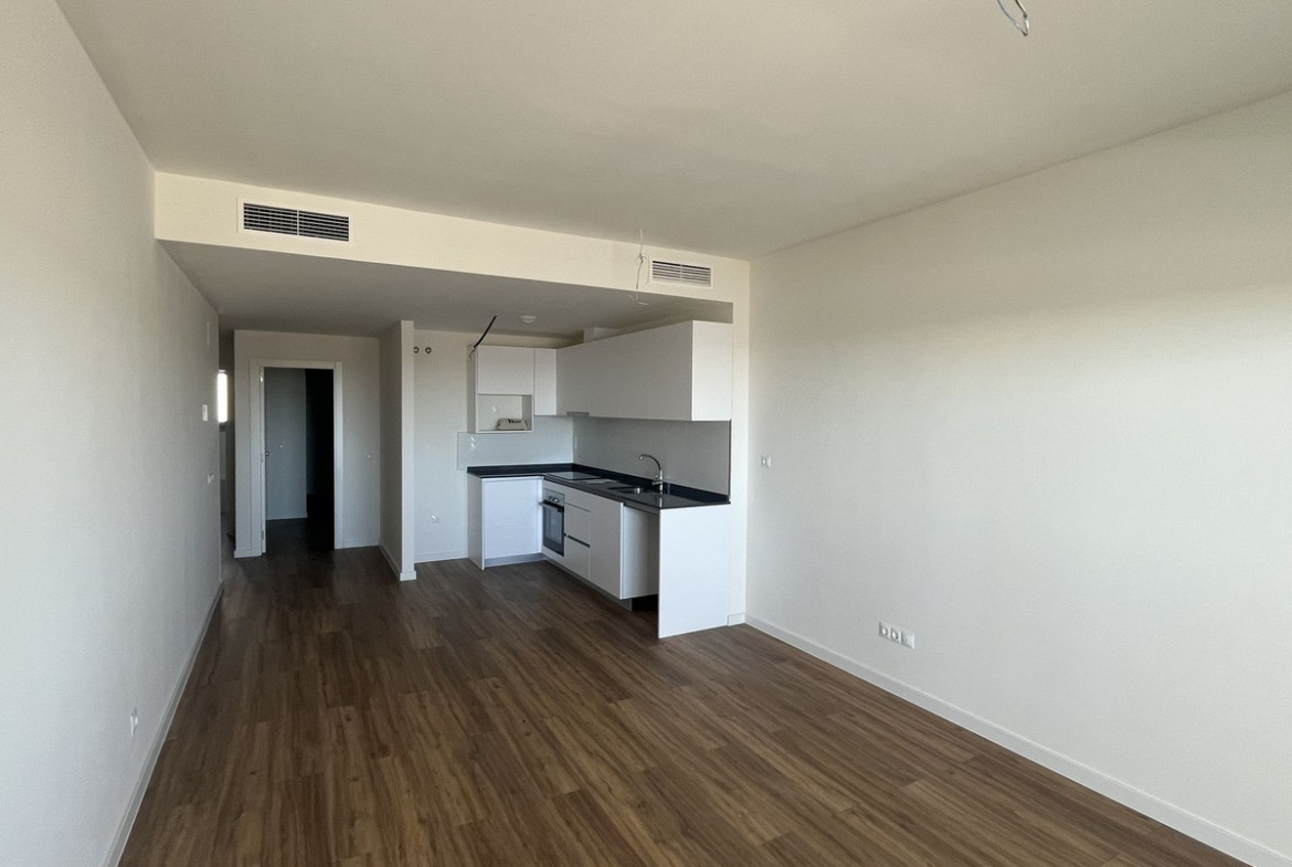 Functional layout – two bedrooms (including a master suite with its own bathroom), a second full bathroom, and a bright open-plan living area connected to the terrace through large glass doors.