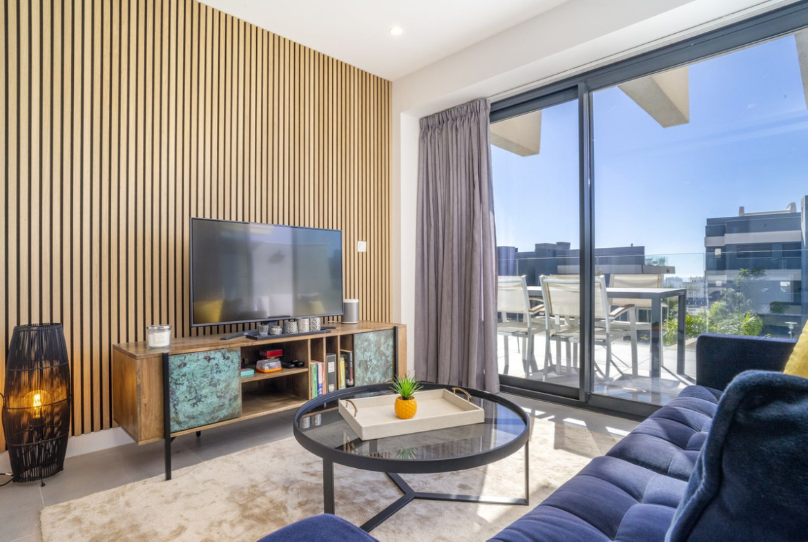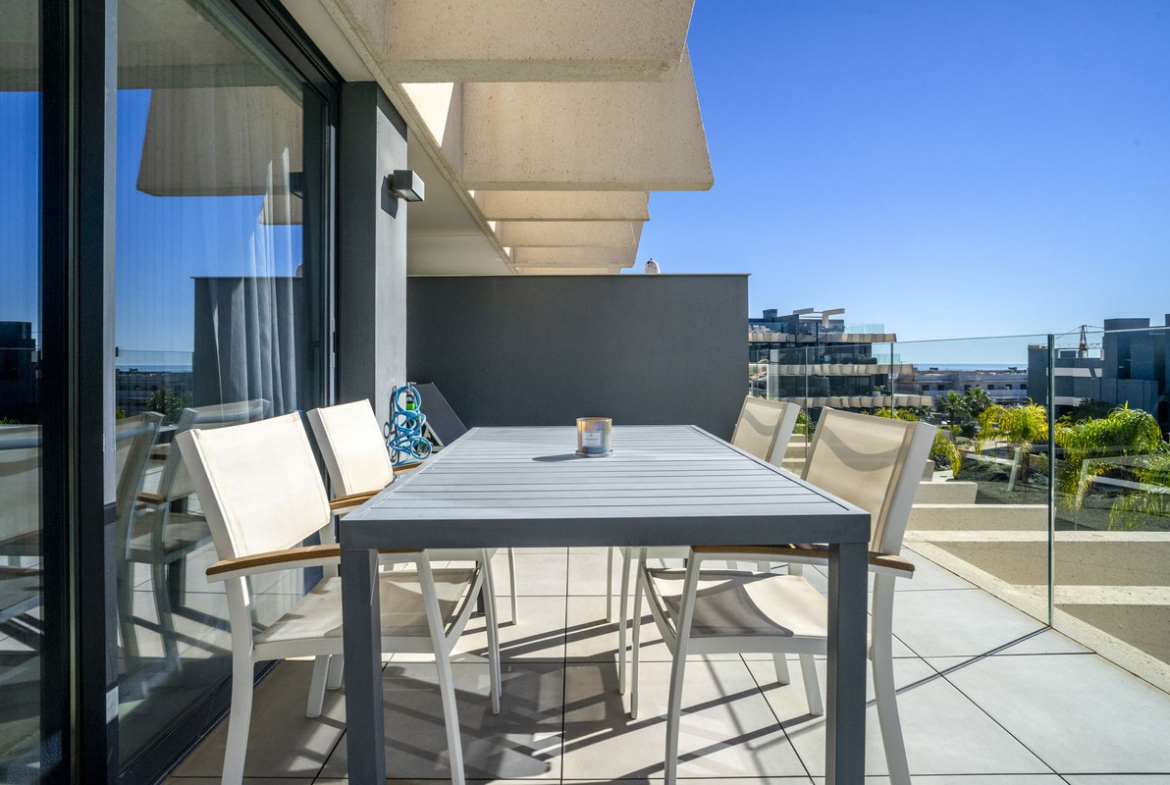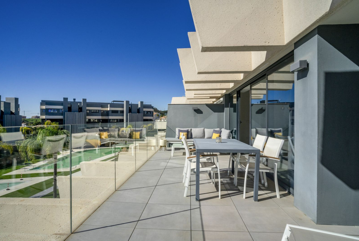 The apartment enjoys a privileged south-facing orientation, allowing natural light to flood the interior throughout the day. The spacious open-plan living and dining area connects seamlessly with a generous 27.83 m² terrace, creating a harmonious indoor-outdoor living experience. From here, you enjoy open views over the beautifully landscaped gardens and communal pool area, as well as a subtle glimpse of the Mediterranean.