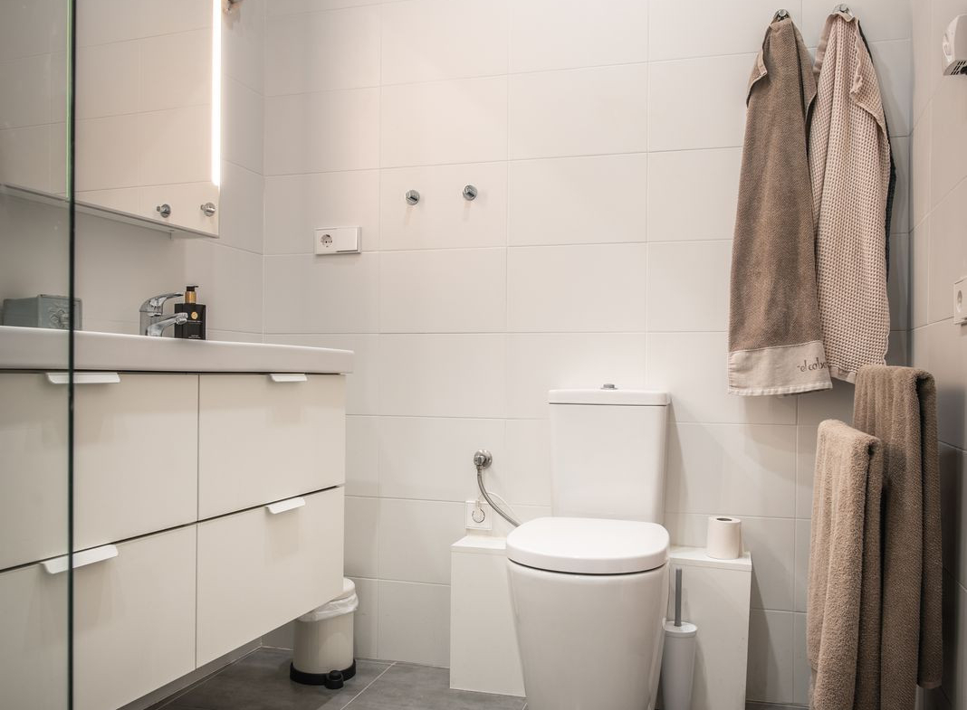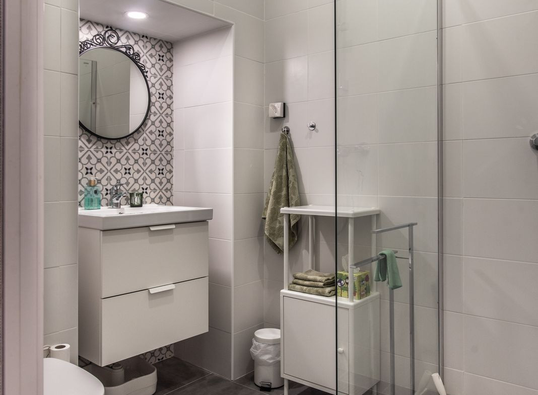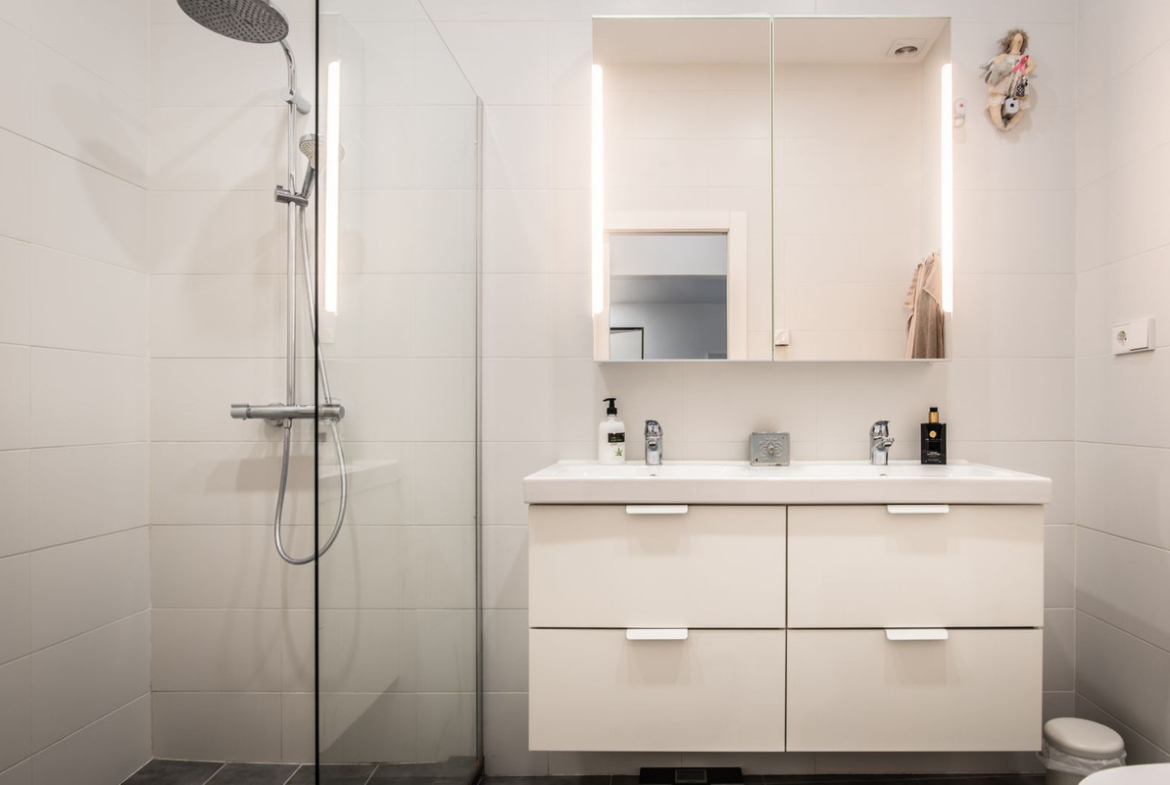 The apartment has two bedrooms and two bathrooms, one master bedroom with built in closets and a private bathroom with a large shower, and one extra bedroom connected to a bathroom with shower. Double beds can be accommodated in both bedrooms. New air conditioner has been installed in the apartment in 2020.