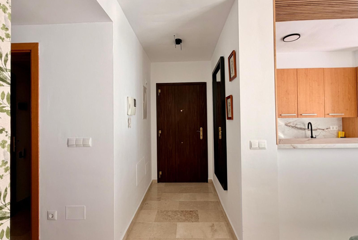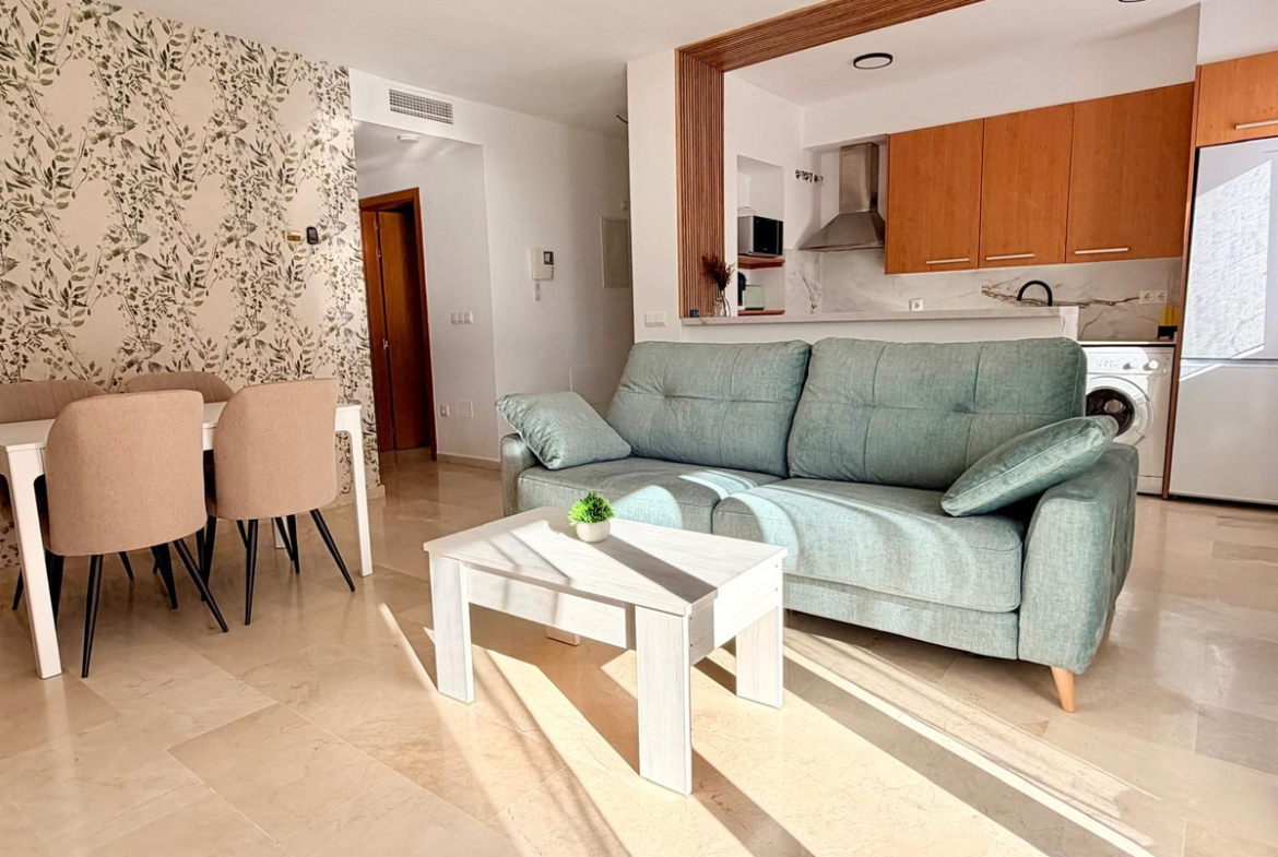 The apartment comprises a spacious and bright living-dining room with direct access to the terrace, a fully equipped open-plan kitchen with a contemporary design, two bedrooms with fitted wardrobes, and a full bathroom