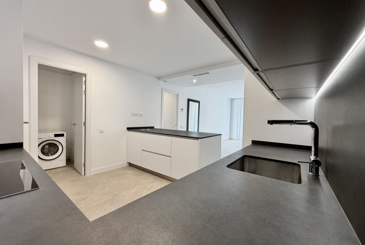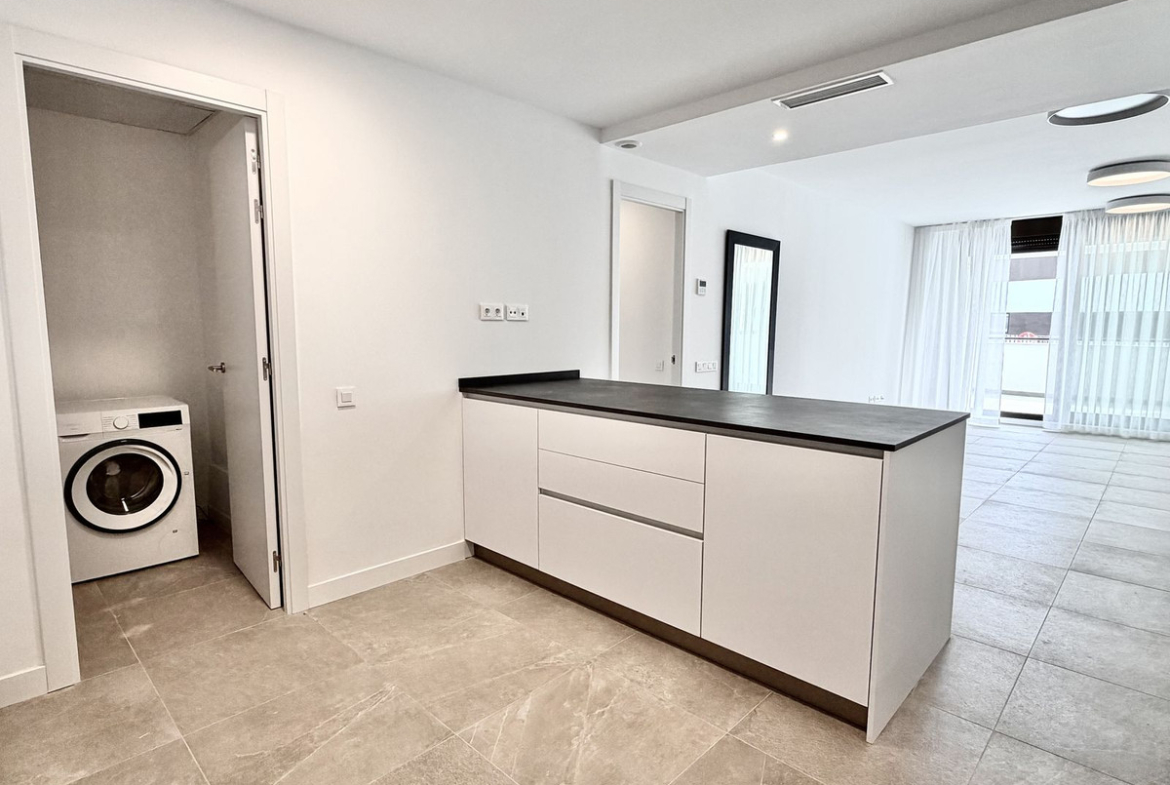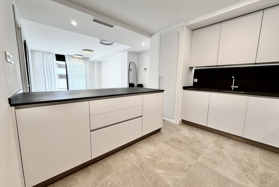 The open-plan living area with a modern kitchen opens onto a spacious private terrace — perfect for enjoying the Mediterranean lifestyle.