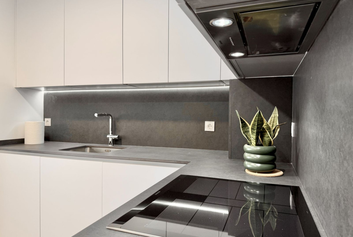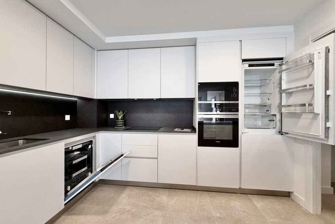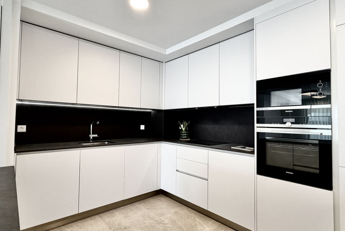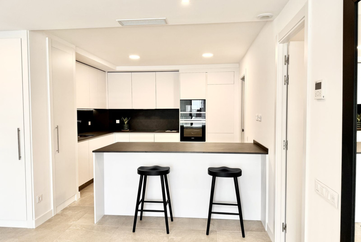 The open-plan living area with a modern kitchen opens onto a spacious private terrace — perfect for enjoying the Mediterranean lifestyle.