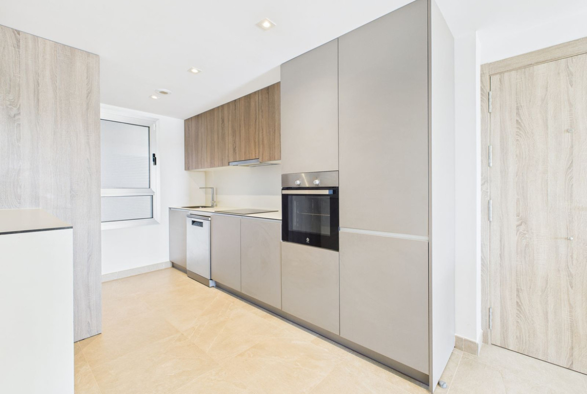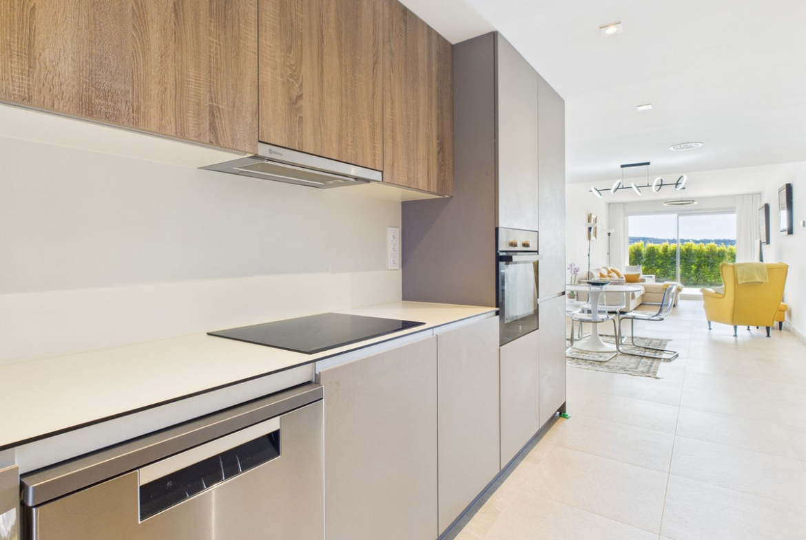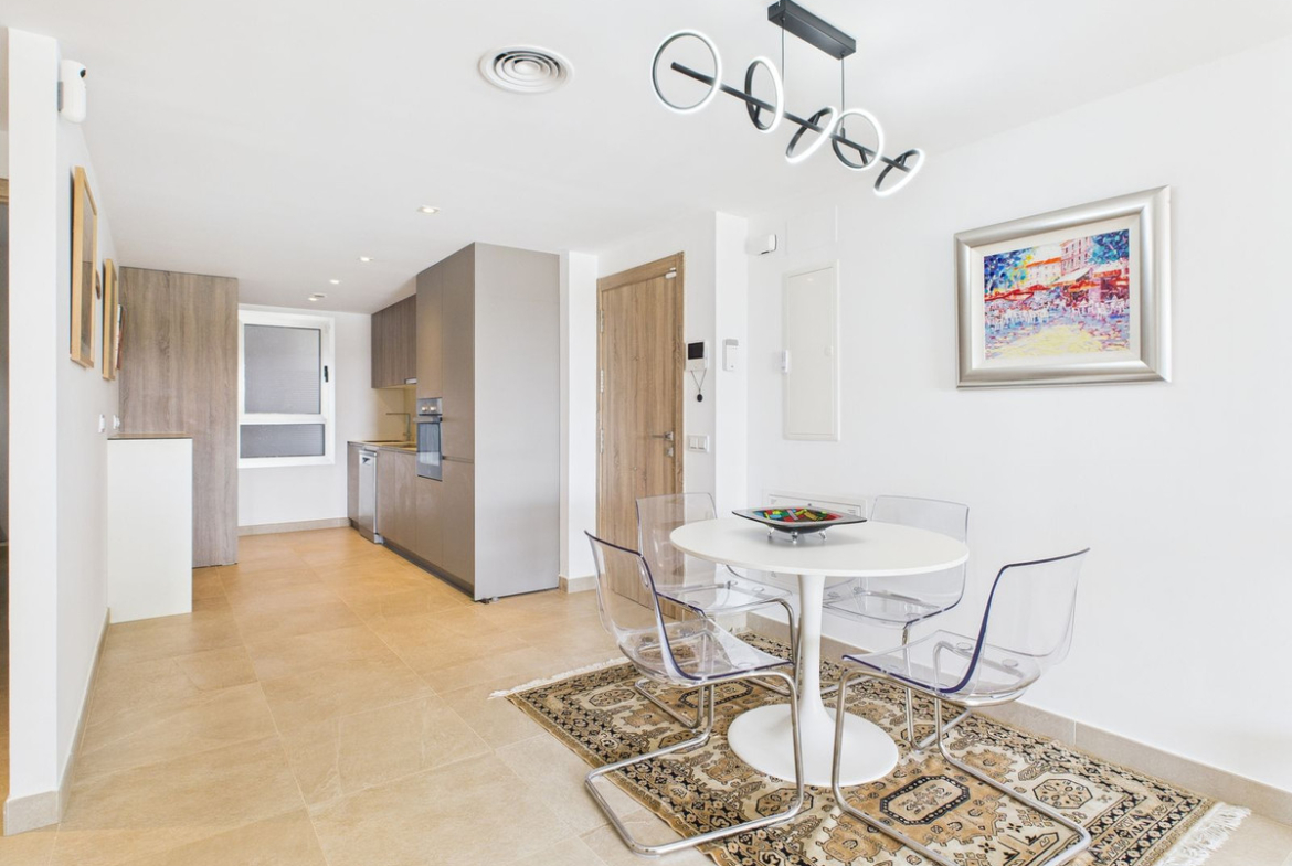 Completed in 2024, the apartment enjoys a bright and spacious open-plan layout, featuring a generous living and dining area that flows seamlessly onto a private terrace with garden and mountain views. With its southwest orientation, the property benefits from sunshine throughout the afternoon and spectacular sunsets over the surrounding hills.