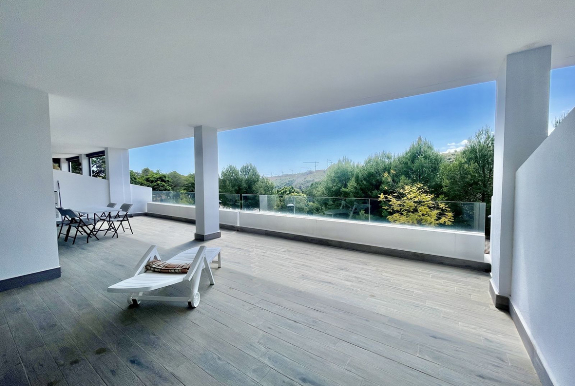 The terrace, featuring both covered and open areas, is ideal for outdoor living year-round, with open green views creating a serene and private setting. There is also the option to enclose part of the terrace with Lumon glass curtains, adding a versatile space that can be enjoyed in all seasons.