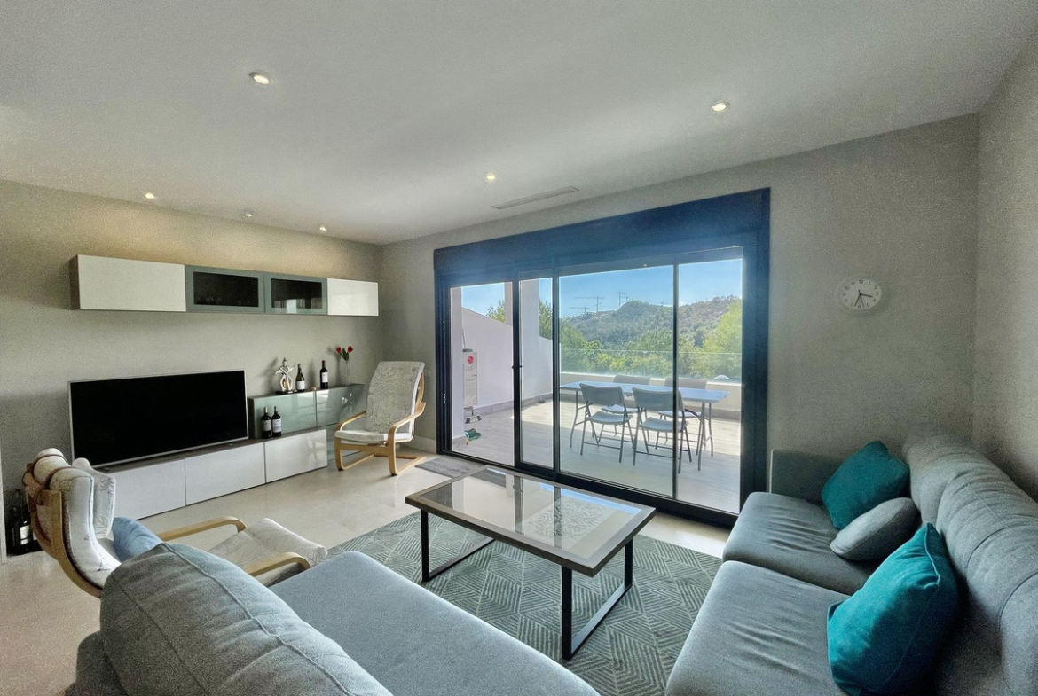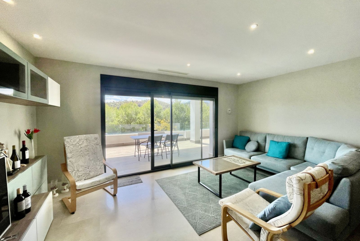 Inside, the apartment boasts a bright and airy layout with an open-plan living and dining area that flows seamlessly onto the terrace. Both bedrooms are spacious and enjoy direct access to the outdoor area, enhancing the indoor-outdoor lifestyle this home offers. The property is finished to a modern standard throughout, with two full bathrooms and a fully fitted kitchen with Bosch appliances and separate utility room.