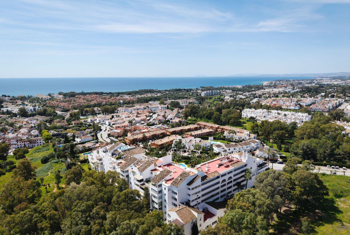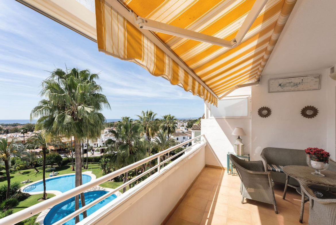 Top floor apartment in the popular complex of Nordic Royal Club. Situated on the 5th floor gives the apartment beautiful views over the well kept garden towards the sea. There are 2 well sized bedrooms and 2 bathrooms. The lounge area and master room opens up towards the glassed in terrace. The urbanisation has a 24 hr reception ensuring good security and peace of mind. The apartment comes with an underground parking and storage room. From the parking there is access to the apartment floor by the elevator. Hot and cold water are included in the community fee.