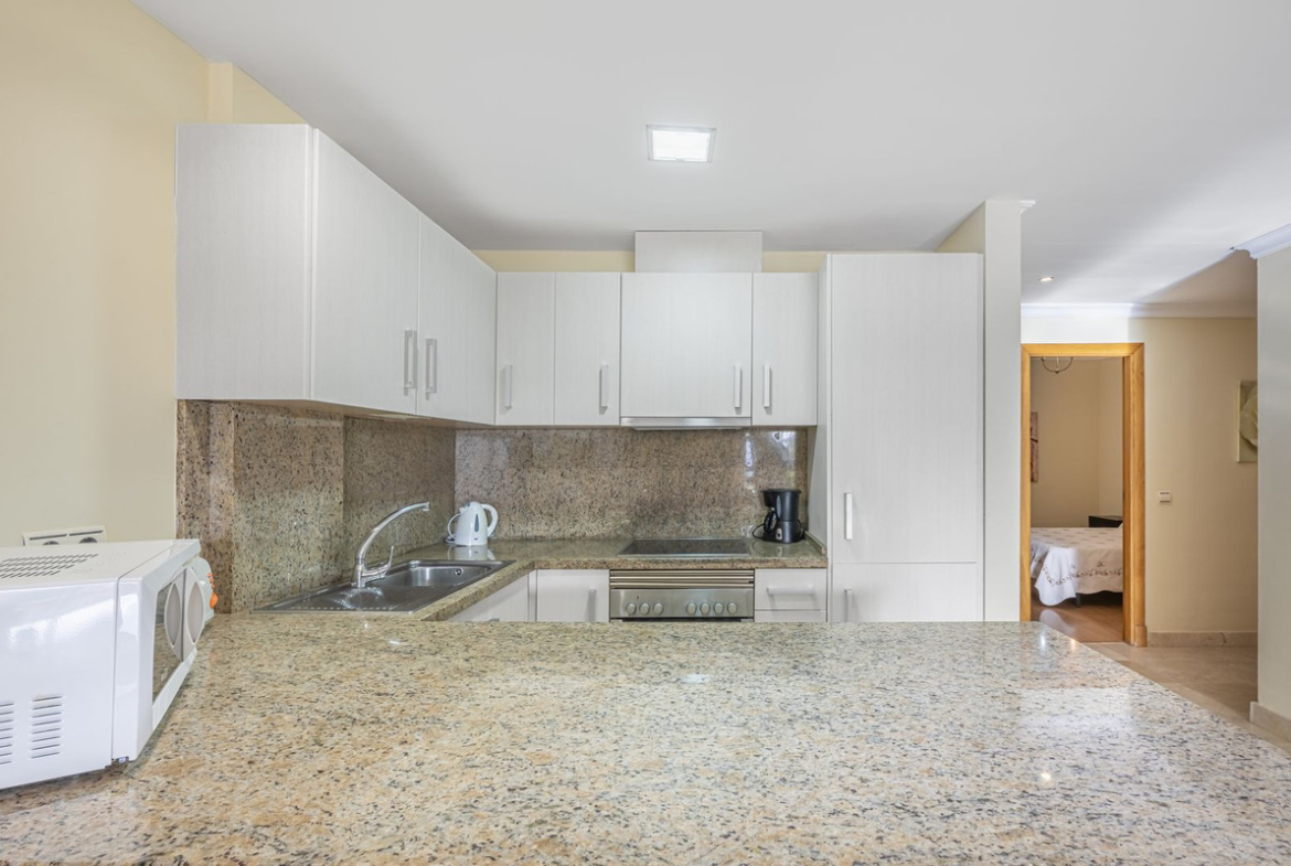 The property is located within a gated residential complex with communal gardens and a swimming pool. It includes a private parking space, with the option to purchase an additional parking space for €15,000.