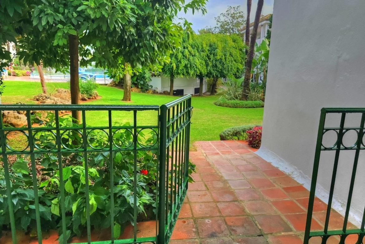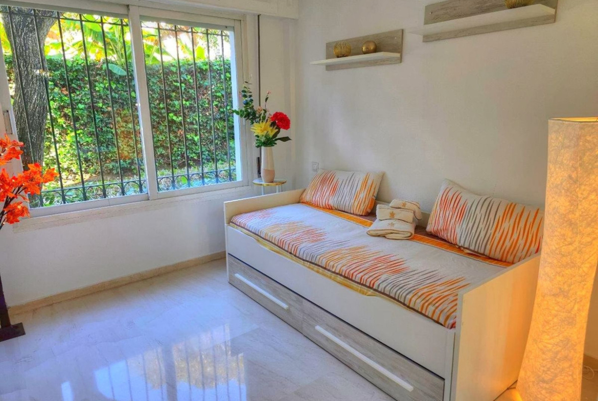 2 bedrooms, 1 bathroom, 1 salon with dining area, 1 american kitchen, great terrace with garden views and direct access to garden, pool and beach.