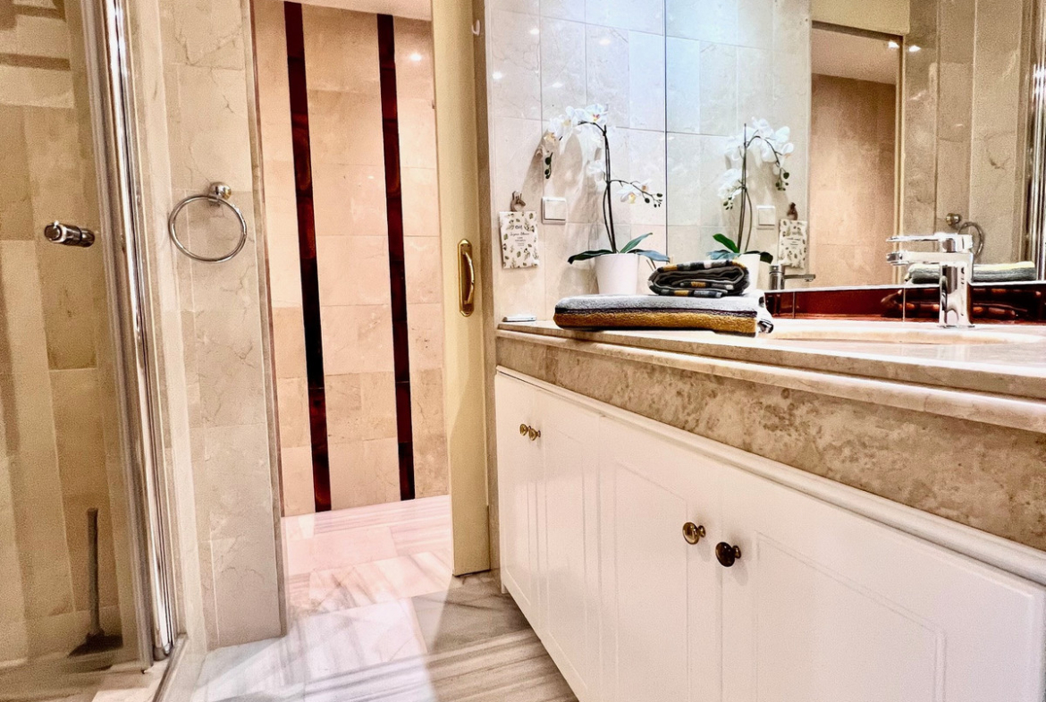 The bedrooms have built-in wardrobes. Everything is perfectly maintained and fitted with timeless materials, including lots of marble in the bathrooms with spacious showers.