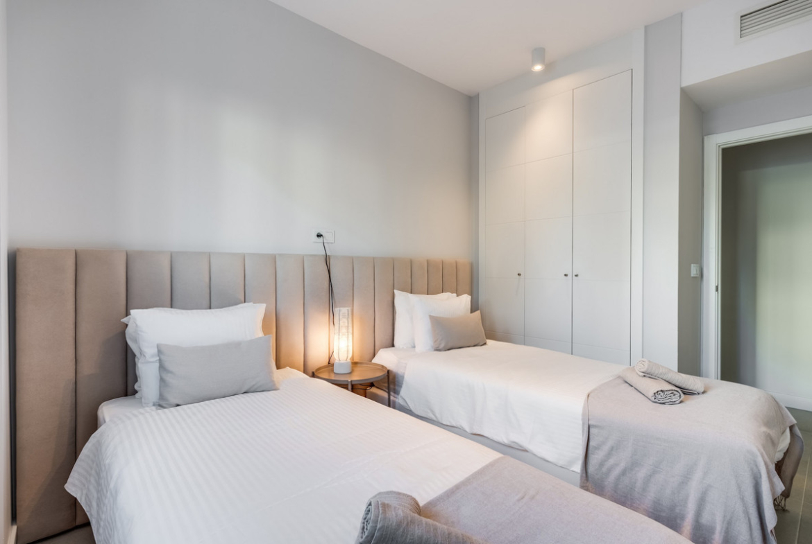 The apartment features two beautifully designed bedrooms, including a serene master suite with its own en-suite bathroom, along with a second contemporary bathroom. The bright open-plan living area flows seamlessly onto a spacious 40m² terrace and an 80m² private garden, creating an outstanding 120m² of outdoor living space perfect for relaxing, entertaining, and enjoying the Mediterranean climate. A modern, fully equipped kitchen completes the interior, offering both functionality and elegant design.