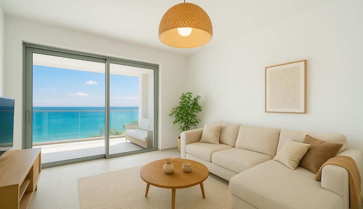 It features a sophisticated interior where modern aesthetics combine with warmth and functionality. The spacious living room is filled with natural light, thanks to its floor-to-ceiling windows that frame stunning views of the Mediterranean.