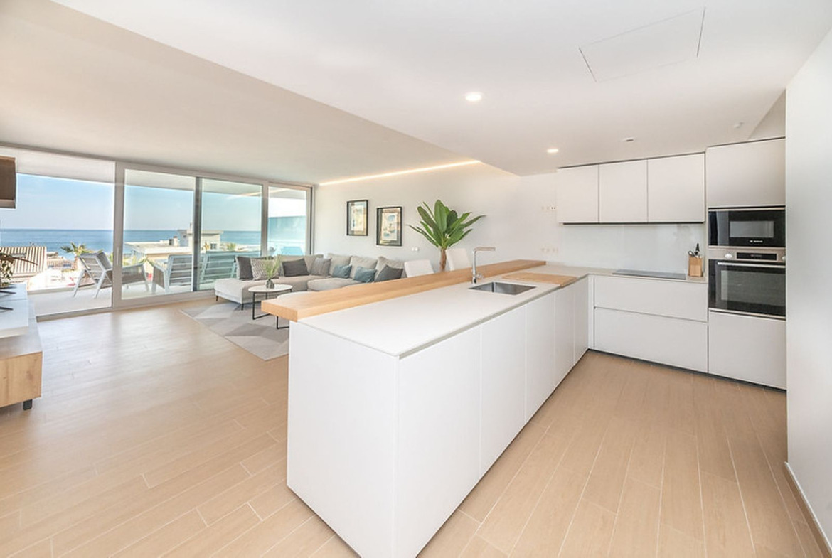 The property offers a bright and well-designed layout with large windows that create an open and airy atmosphere. The modern kitchen is seamlessly connected to the living room, creating a social and inviting space. From here, you access the spacious terrace with beautiful sea views – the perfect spot for breakfast in the sun, dinners with friends or relaxing all year round.