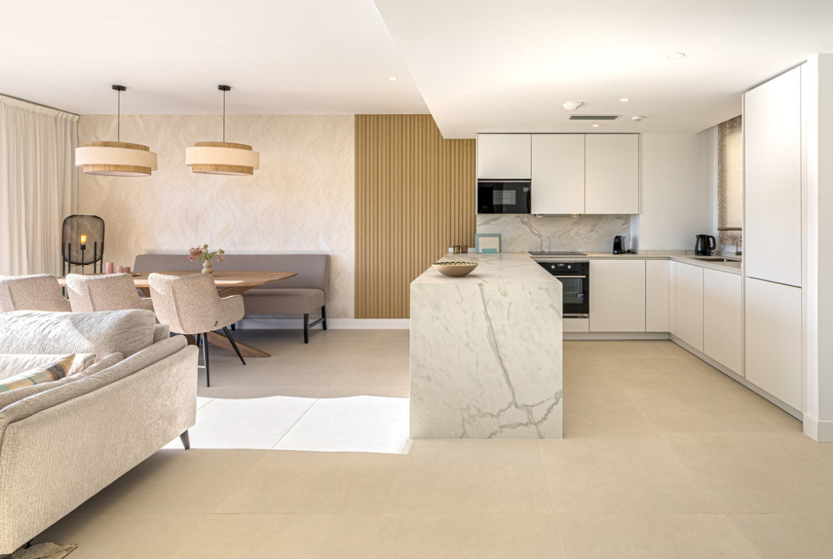 This elegant property offers 2 spacious bedrooms and 2 beautifully designed modern bathrooms, created with comfort and refined contemporary living in mind. The bright open-plan living space is flooded with natural light and flows seamlessly onto an impressive 50 m² private terrace, undoubtedly one of the home’s standout features. Here, you will find a luxurious jacuzzi, creating the perfect setting to unwind while enjoying breathtaking sunsets and partial sea views thanks to its privileged southwest orientation.