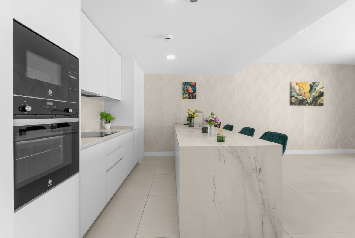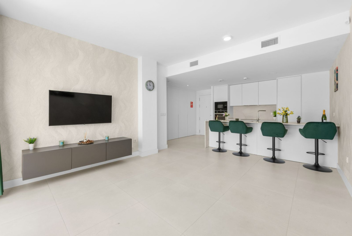 ✨ Bright open-plan living area, perfectly laid out, integrating the living room, dining area, and a fully equipped kitchen with high-end appliances.
