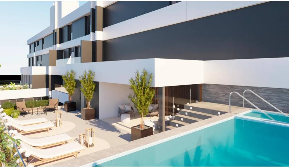 Splendid 2 bedroom 2 bathroom middle floor apartment with terrace with views on the courtyard in a newly constructed modern complex in the city center of the lively Fuengirola.