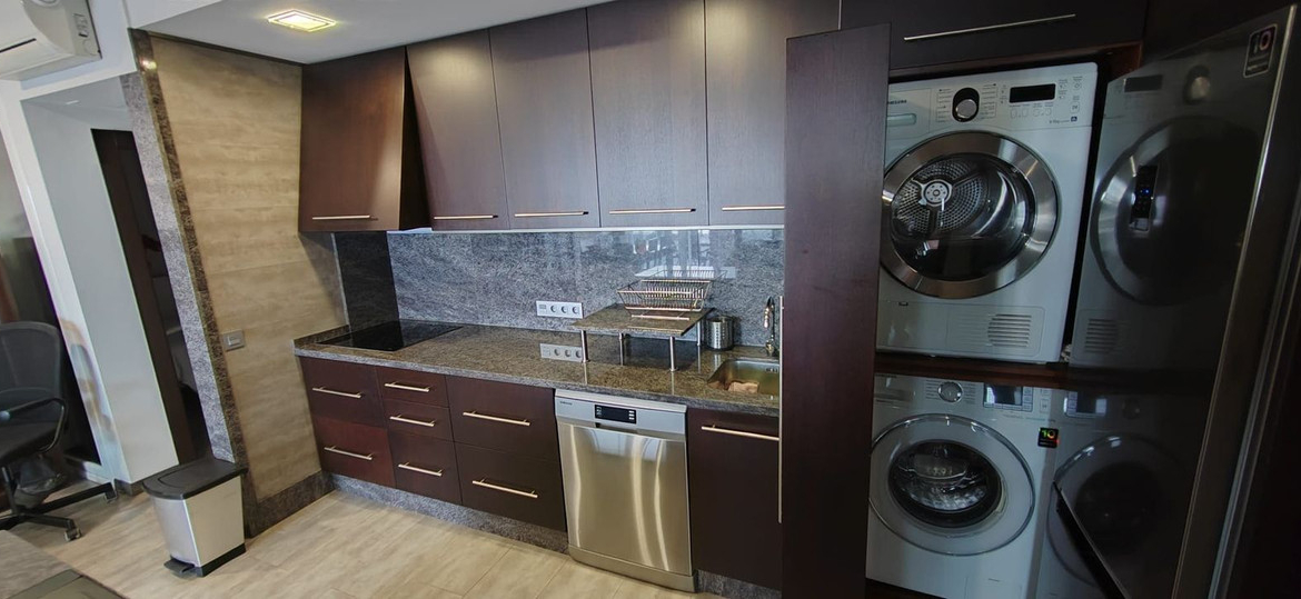 The property offers approximately 60 m², distributed into 2 bedrooms with fitted wardrobes, 2 full bathrooms with walk-in showers, and a fully equipped open-plan kitchen with breakfast bar, integrated into a bright and welcoming living-dining area.