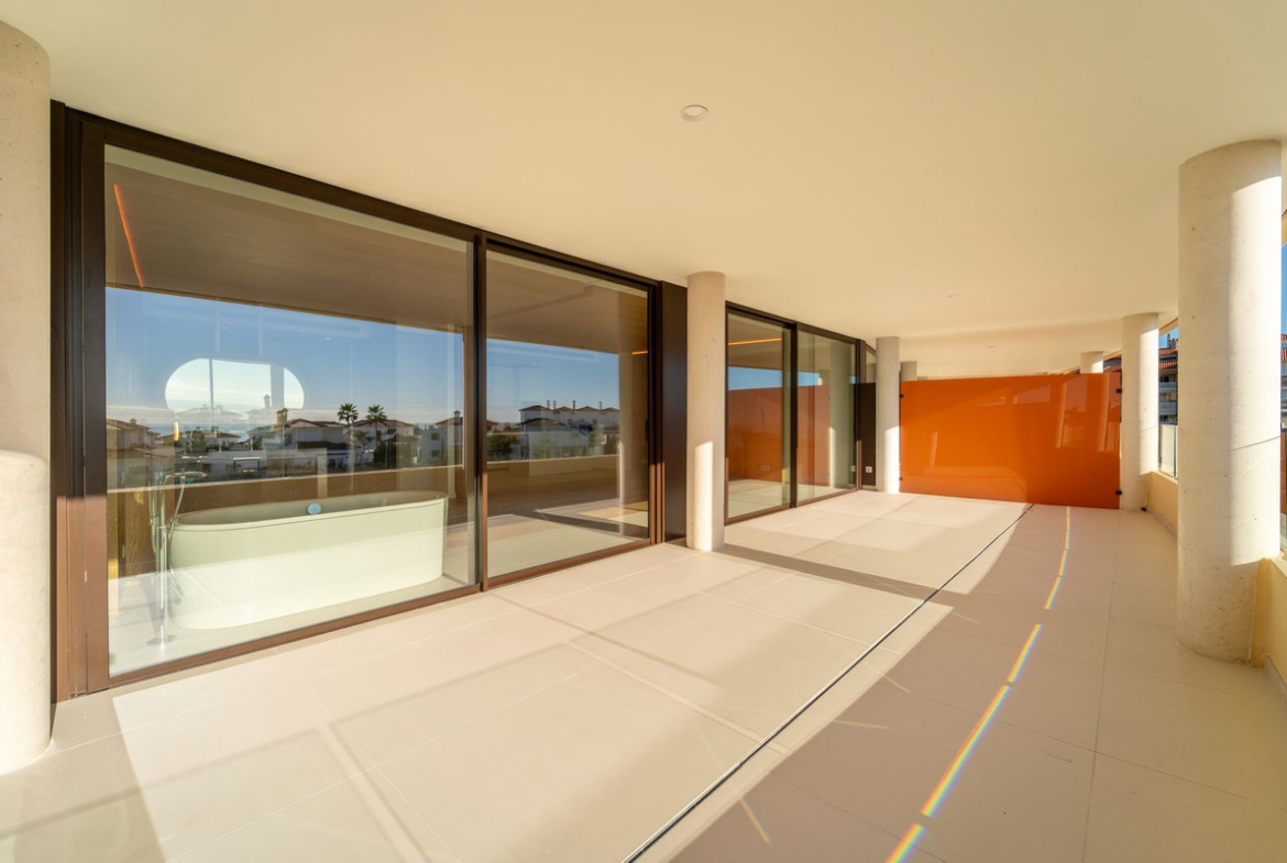 Main bedroom with ensuite bathroom and walk-in closet. This apartment is distinguished by the ingenious movable wall that connects the master bedroom-suite to the living room. This elongated sliding door is designed to duplicate the entrance of natural light and enjoying much better views. This easy interaction between the living spaces creates a flexible open area that is designed for you to enjoy the climate and lifestyle of Southern Spain. This clever design not only maximises the natural light of the Costa del Sol in both rooms, but also allows you to admire the splendid views from every corner of your home. Air conditioning hot and cold, video intercom, domotic system, pre-installation alarm system, water filter system, under floor heating in both bedrooms and bathrooms. Includes two parking spaces (one with electric car charger) and one storage room.
