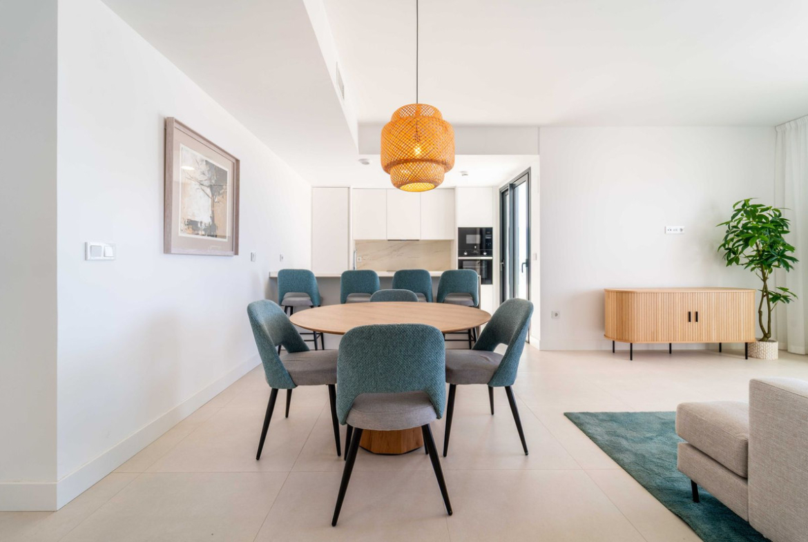 This recently completed property offers 120 m² of interior space plus a spacious south-facing terrace, designed to maximise natural light and open Mediterranean views. The layout combines a bright living-dining area with a contemporary open kitchen and breakfast bar, creating a functional and elegant living space.
