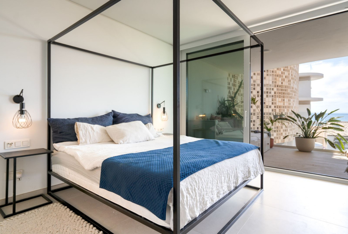 The master bedroom has direct access to the terrace and includes an en-suite bathroom with walk-in shower. Additional bedrooms are well-proportioned and share a second bathroom.