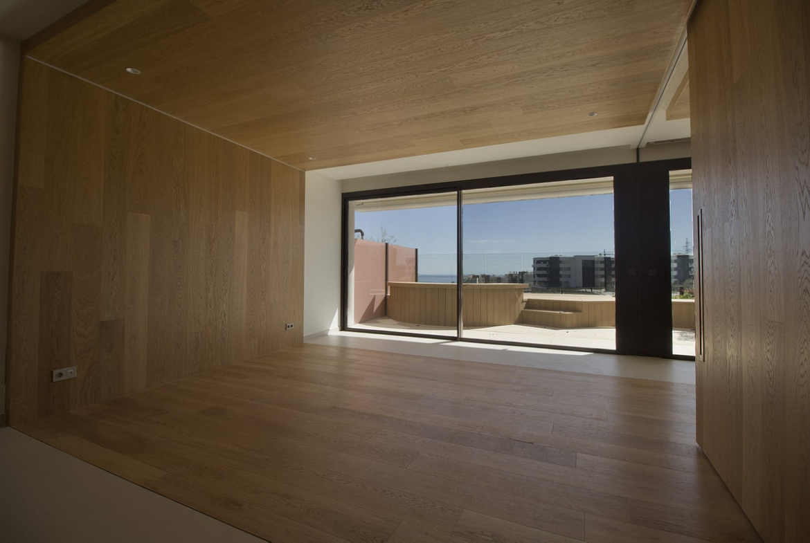 Inside, the apartment stands out for its contemporary loft-style design, emphasizing space, light, and flexibility. The open-plan kitchen is fully equipped with high-quality appliances and seamlessly connects to the living area, creating a bright and sociable atmosphere. The main bedroom features an open-plan bathroom with shower, while the toilet is separate for added comfort. A sliding wall allows the main bedroom to be opened up to the living room, offering a unique sense of space and adaptability. Large windows lead to an expansive 49 m² terrace with beautiful views over the valley and towards the sea, extending the living area outdoors and filling the interior with natural light. The terrace also features a private jacuzzi, creating an ideal space to relax while enjoying the views. The apartment also includes two parking spaces and a storage room, adding practicality to its modern design.