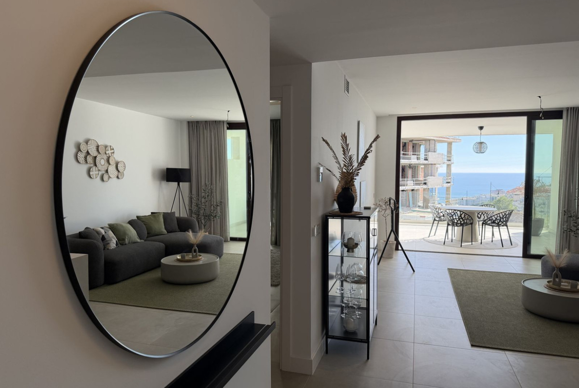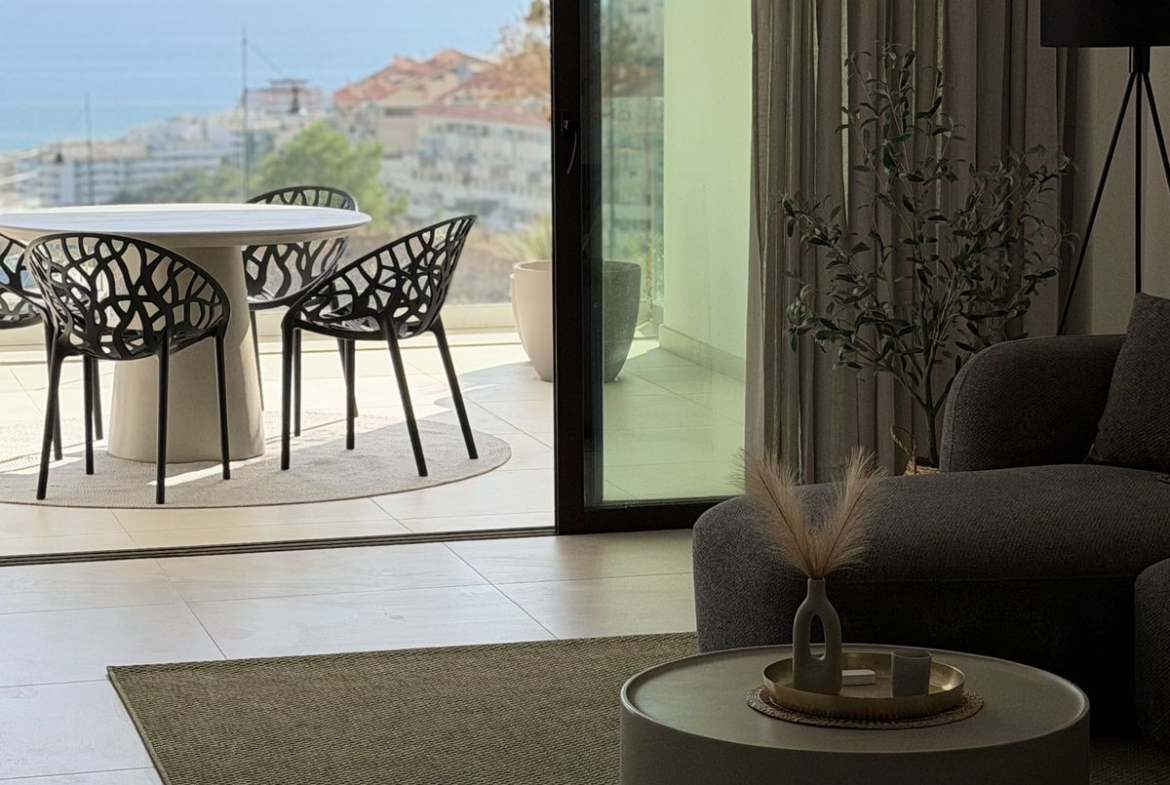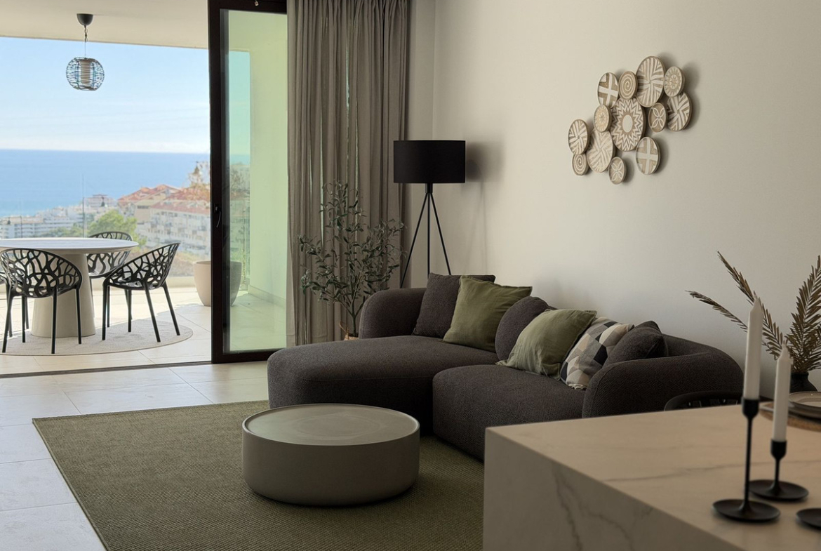 Experience coastal living in this newly built 120 m² ground-floor apartment positioned in the highly sought-after El Higuerón. The home features two generous bedrooms and two modern bathrooms, all finished with top-quality materials and beautiful design. The interiors come fully furnished and include a fully equipped kitchen that blends sleek aesthetics with everyday practicality.