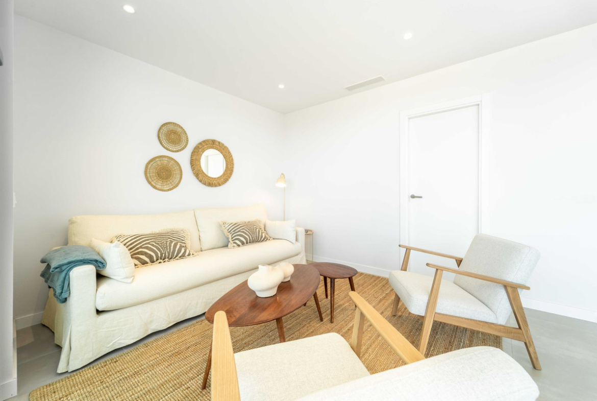 The apartment features two spacious bedrooms and two bathrooms, including a master suite with ensuite layout.. Indoors, comfort is ensured with underfloor heating in the bathrooms, aerothermal climate control, and a modern fitted kitchen. Outdoors, the elevated terrace becomes an extension of the living space — perfect for relaxed mornings, alfresco dining, or evening gatherings.