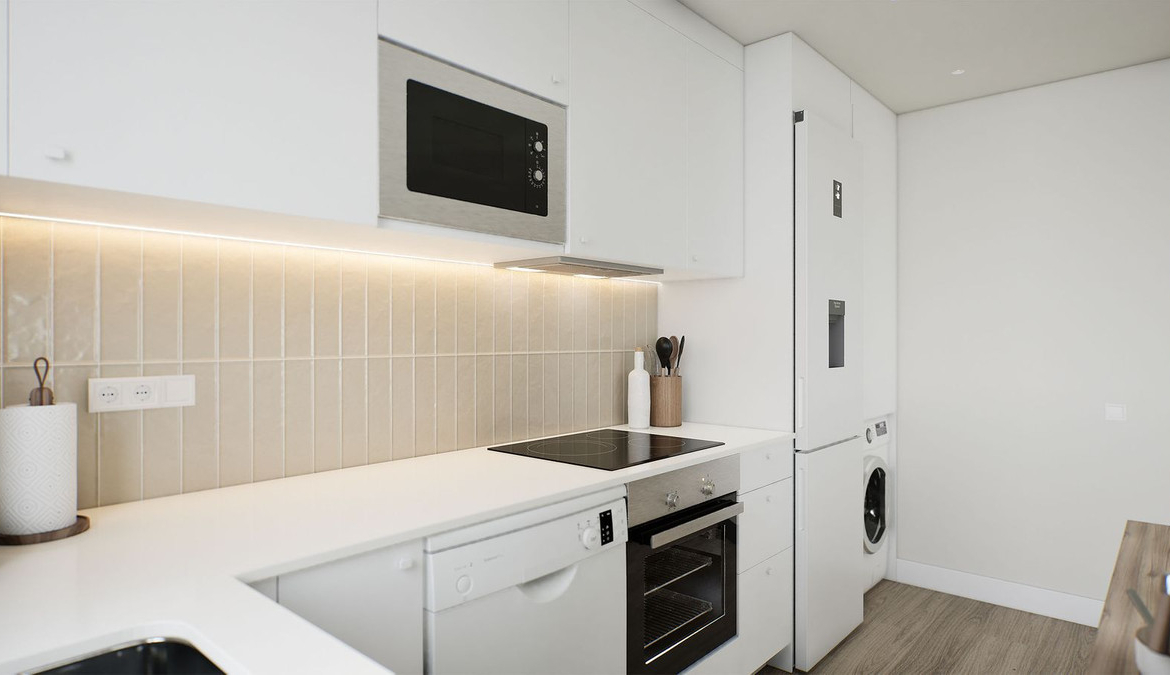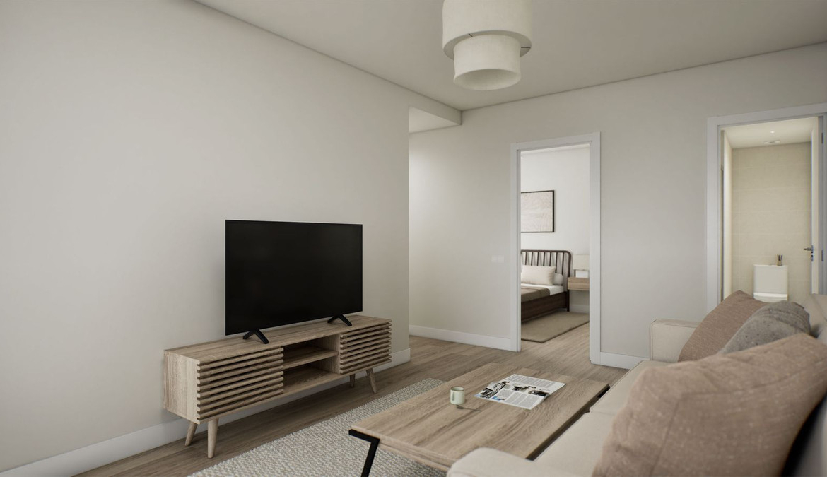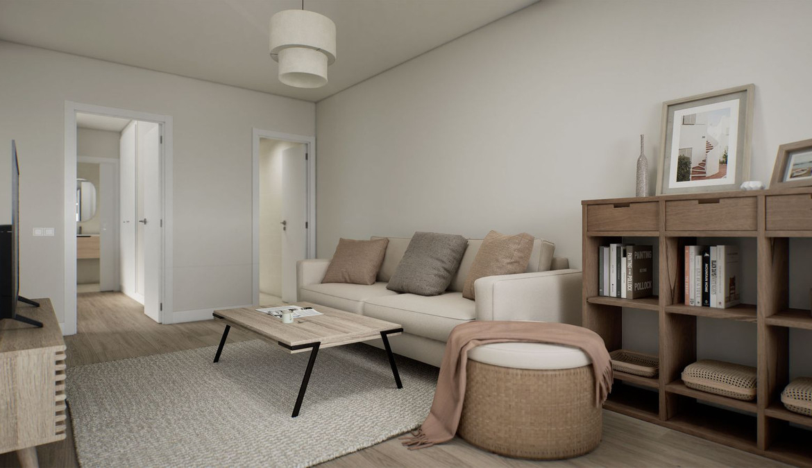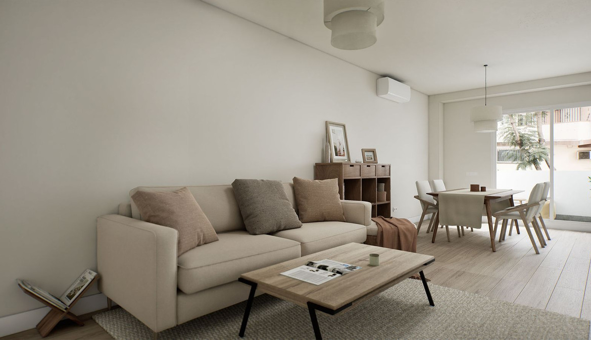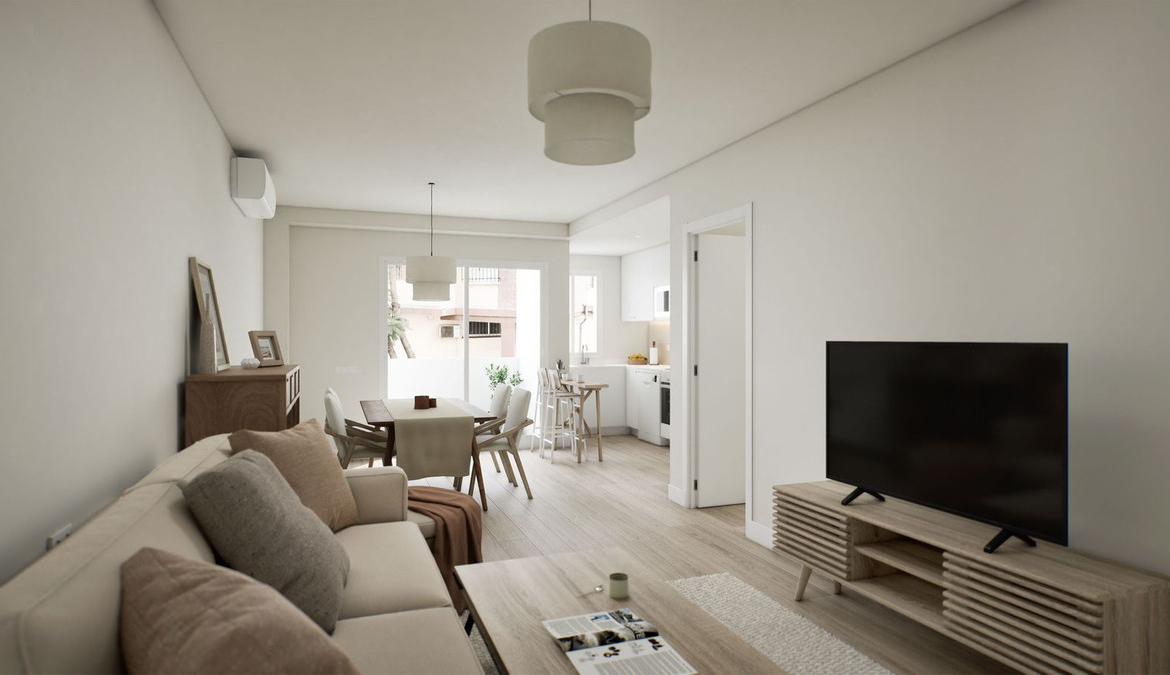 The apartment has a total built area of 64 m², well distributed into a bright living–dining area, a fully fitted open-plan kitchen, two bedrooms with fitted wardrobes, and one modern bathroom. Additional features include air conditioning, wood flooring, and a private terrace, providing a pleasant outdoor space.