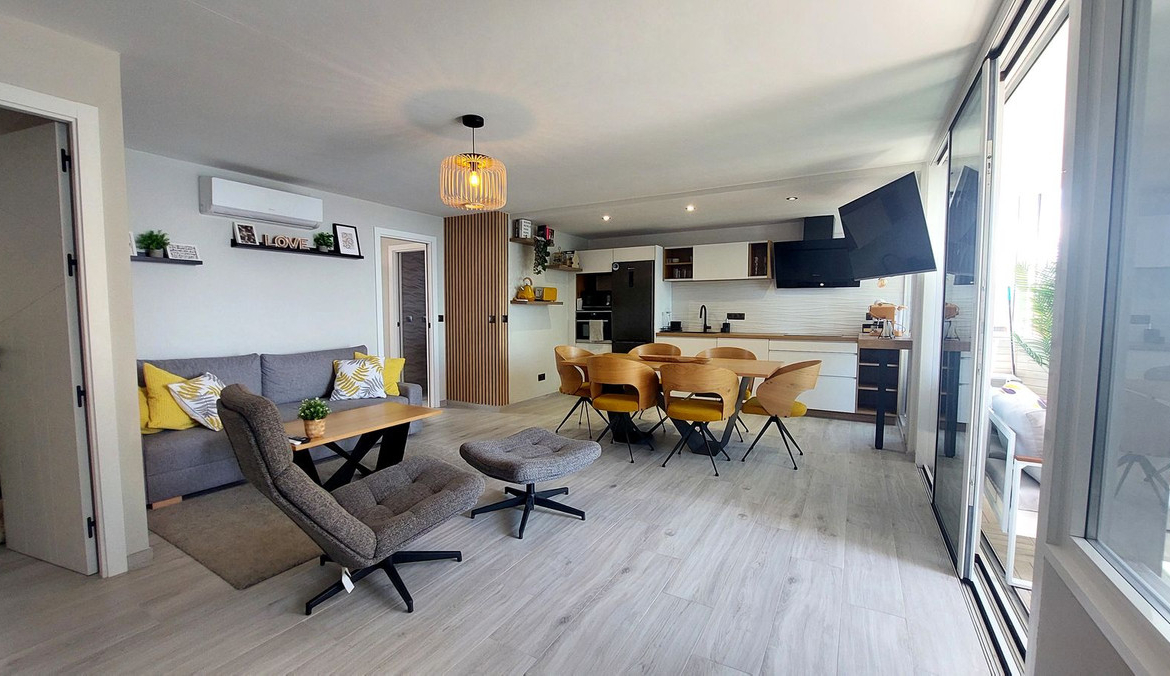 The apartment has been completely renovated to a high standard, featuring a stylish new kitchen, two new bathrooms (one en-suite), and high-quality finishes throughout. It offers two spacious bedrooms, a bright living room, and a private terrace with a hydro-massage bath, where you can relax while enjoying panoramic views of the beach and marina.