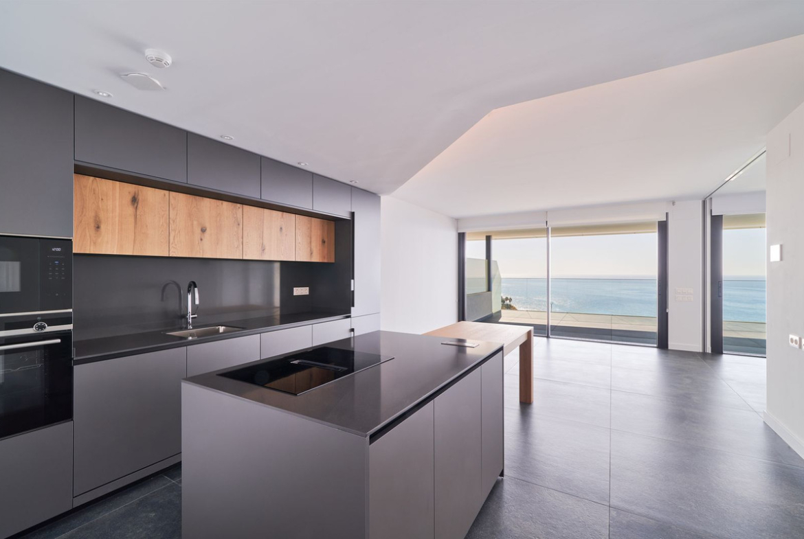 The home enjoys panoramic sea views from its elevated position, with a tiered architectural design that follows the natural slope of the land. Inside, you’ll find a bright and open layout with floor-to-ceiling windows, offering a seamless connection between indoor and outdoor living. The interiors are finished with high-quality materials and a calm, modern design.