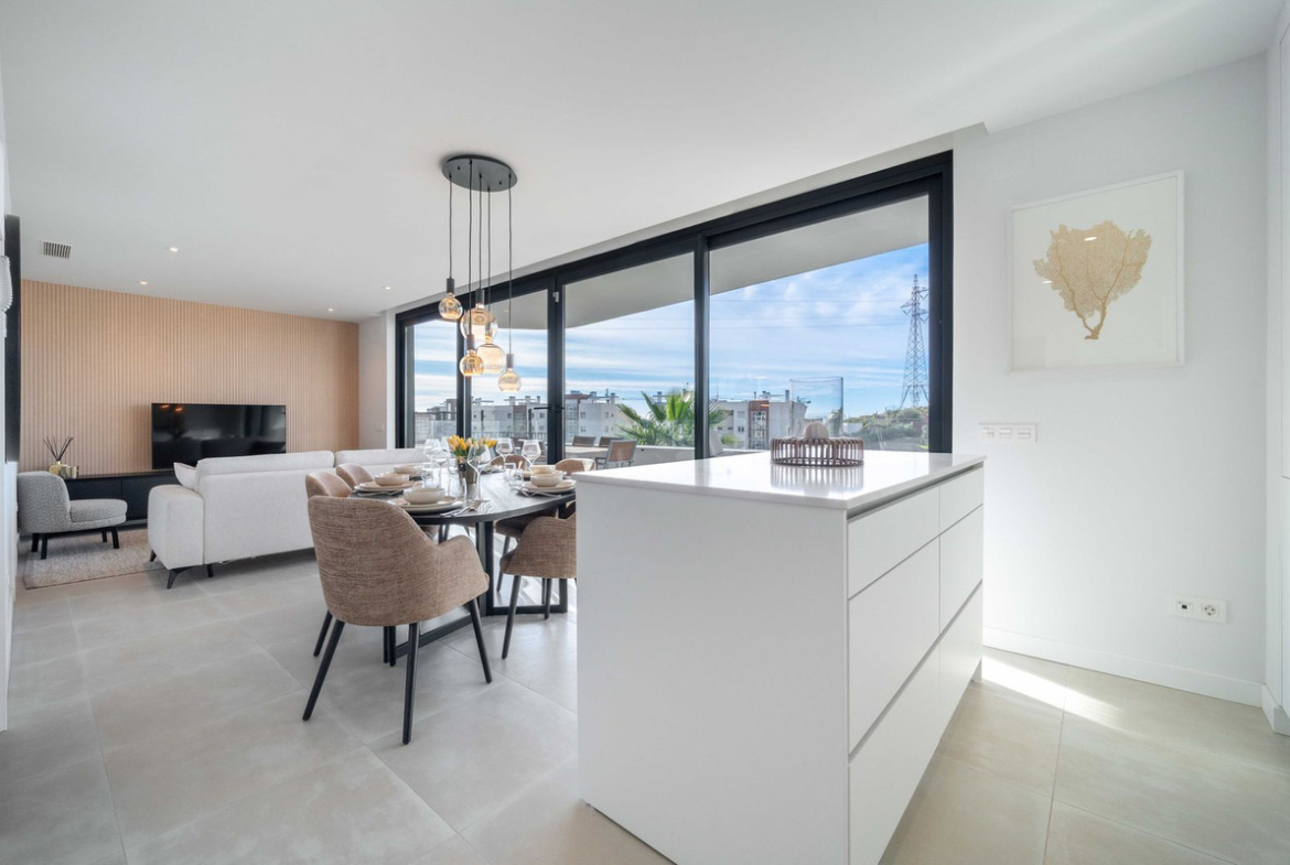 Welcome to this serene and elegant ground-floor apartment that embodies the essence of contemporary Mediterranean living. This thoughtfully presented two-bedroom, two-bathroom home combines modern design with a bright, open-plan living area that flows seamlessly onto a spacious west-facing terrace, providing the perfect setting for al fresco dining, a morning coffee, or relaxing in the sun. Its orientation ensures warm light throughout the day and beautiful sunsets.