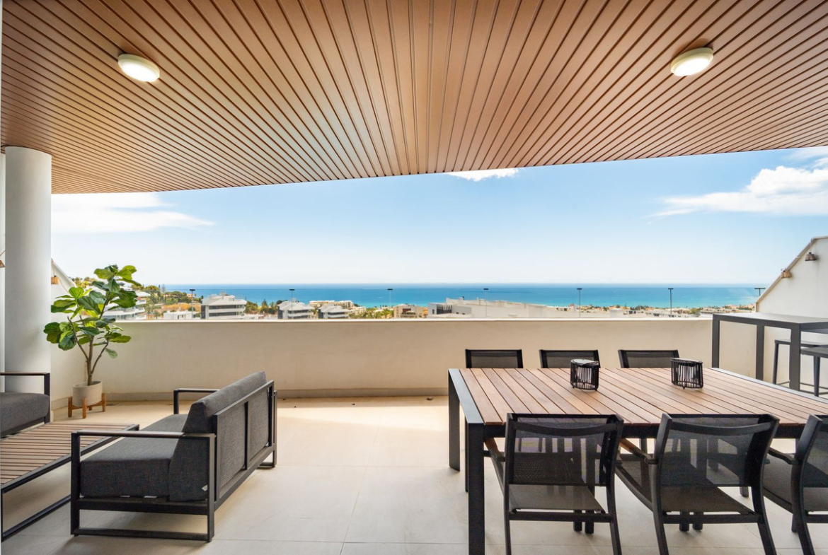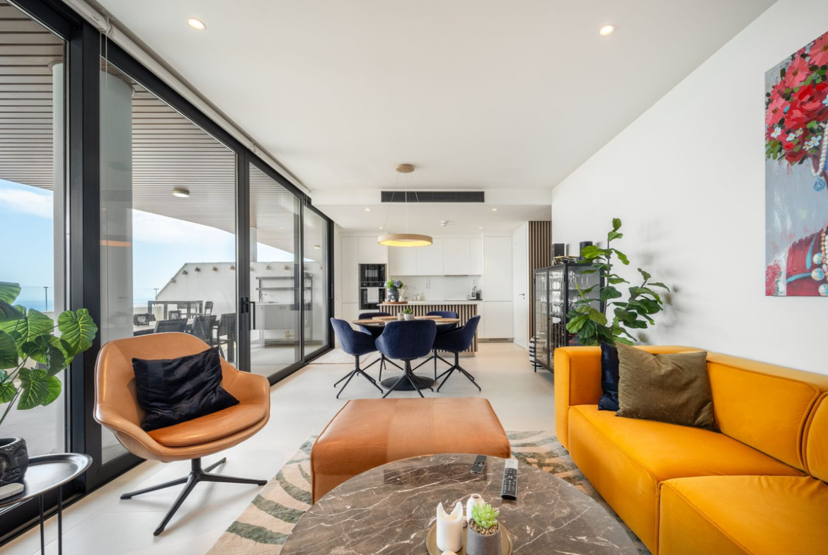 As you enter the front door of the apartment your focus is instantly drawn to the view of the Mediterranean sea which is visible from when you first open the front door. You are then drawn to the open plan living space with its fully fitted kitchen. The wide living space offer floor-to-ceiling windows which can me moved to the side and the living space become one with, the just as wide and generous, terrace where only the sea & sky are the limits. The bedrooms are conveniently situated at the back of the living space and consists of a spacious and private master bedroom with a walk-in closet and integrated master bath room. The apartment also offer a large guest- bedroom and bathroom. Both bedrooms offer mountain views. The position- and the view of this apartment leaves you with a sensation of being in a top-of-the-world location which makes you want to come back for more…