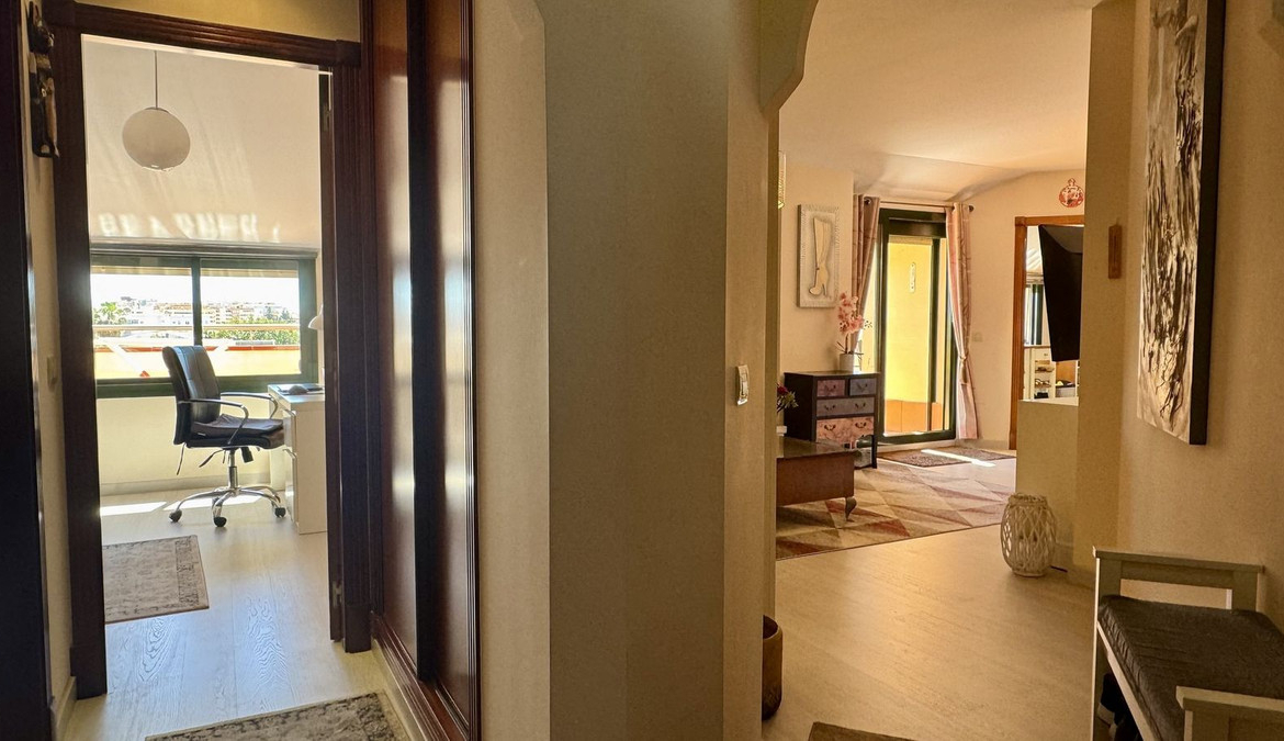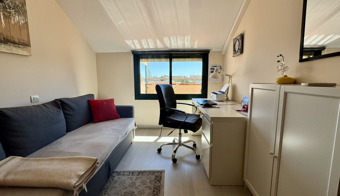 Located on the third floor of a building with an elevator, the apartment has a large 62 m2 sunny roof terrace facing south, east and west, which receives the sun all day long. The terrace offers expansive views of the city of Fuengirola and the mountains. The apartment has a fully equipped separate kitchen. Next to the kitchen is a living room with access to the terrace.