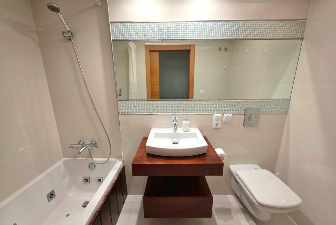 The apartment features two bedrooms and two bathrooms and is sold as it stands, fully renovated, with almost new furniture and equipment, ready to move into. It is a very well-maintained, modern home with an attractive design.