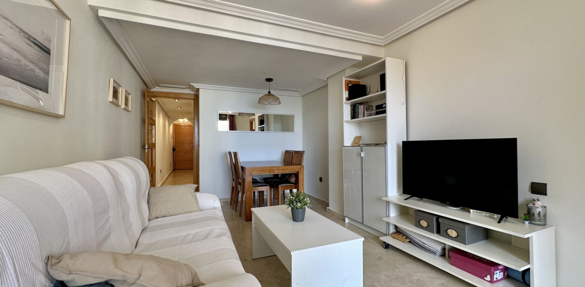 Discover a bright and comfortable apartment located just 100 metres from the sea in one of Guardamar’s most sought-after coastal areas. Positioned on the second floor with lift access, this east-facing home offers beautiful sea views from both the living room and the master bedroom.