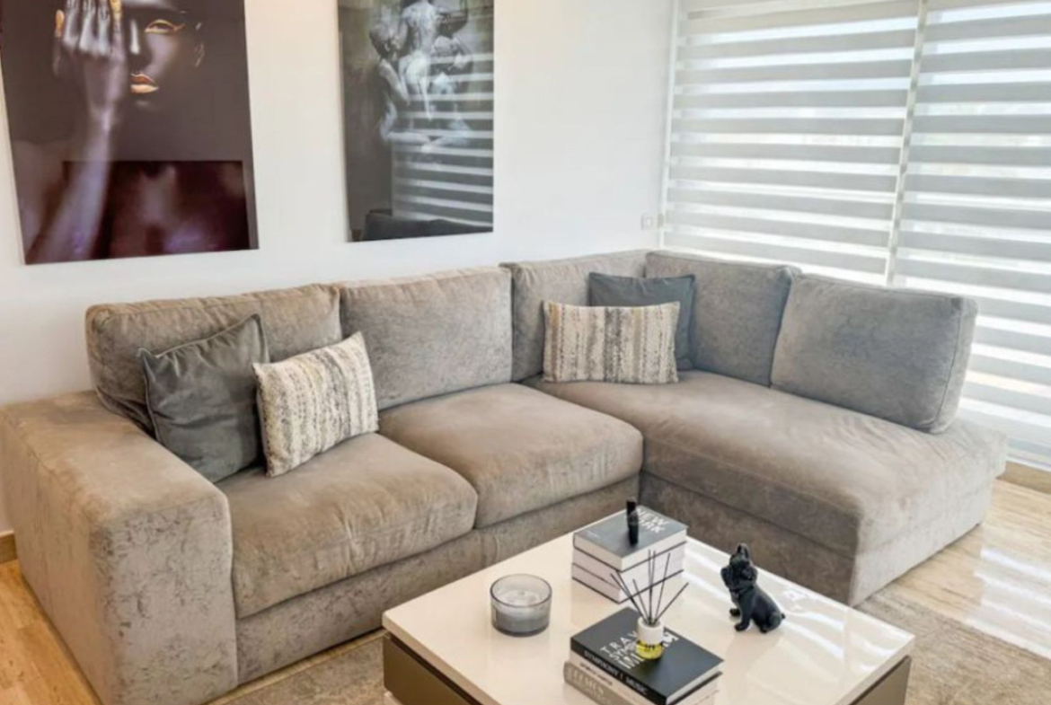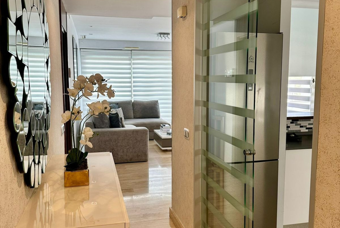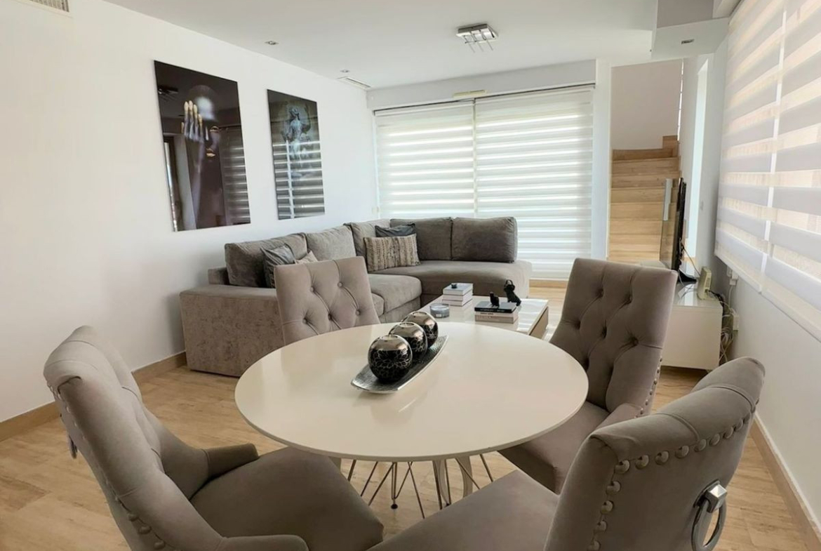 Distributed over two levels, the property offers 2 bedrooms, 2 bathrooms (including one en suite), a bright living-dining area, and a fully equipped kitchen. It also features three private terraces, including a large solarium with a comfortable sitting area perfect for relaxing or entertaining.