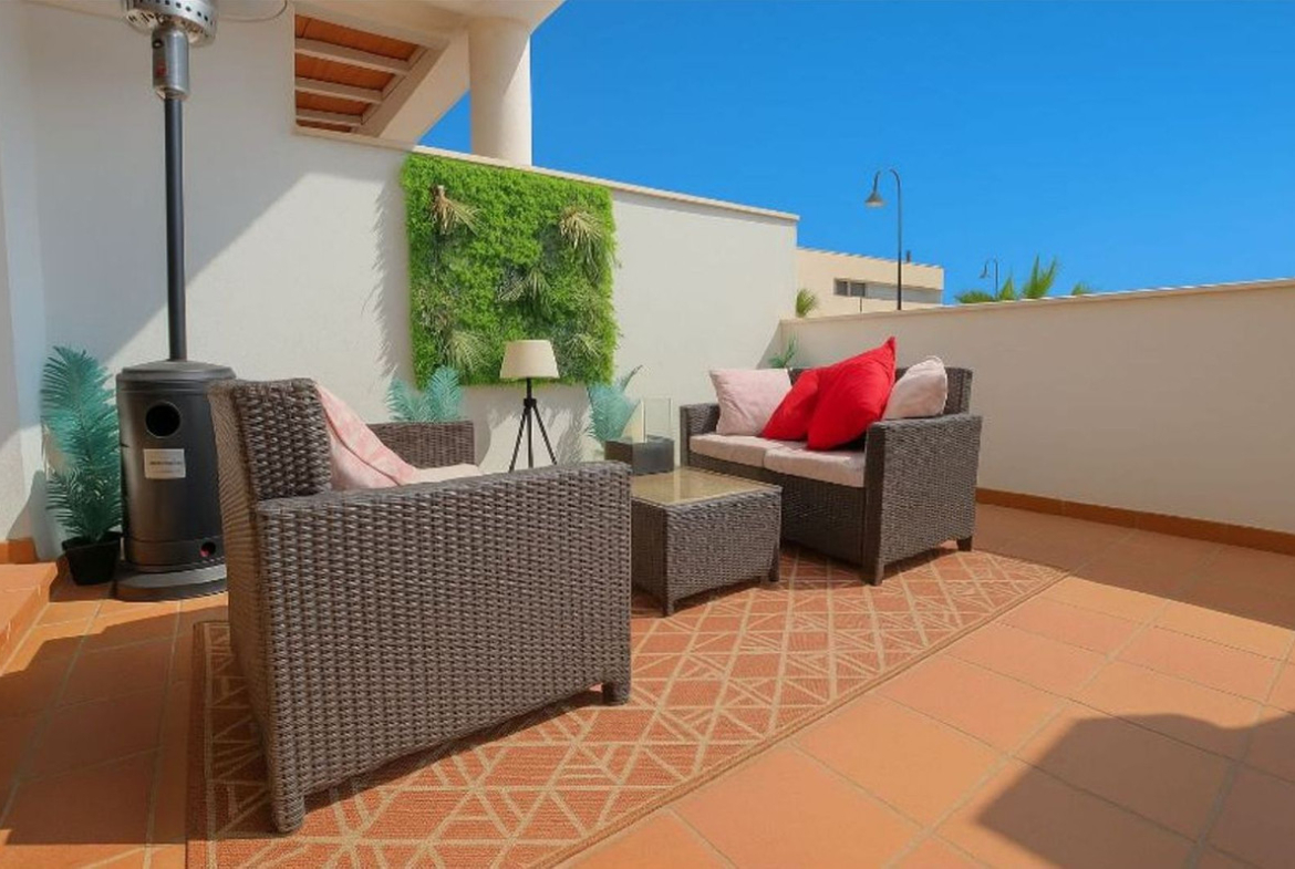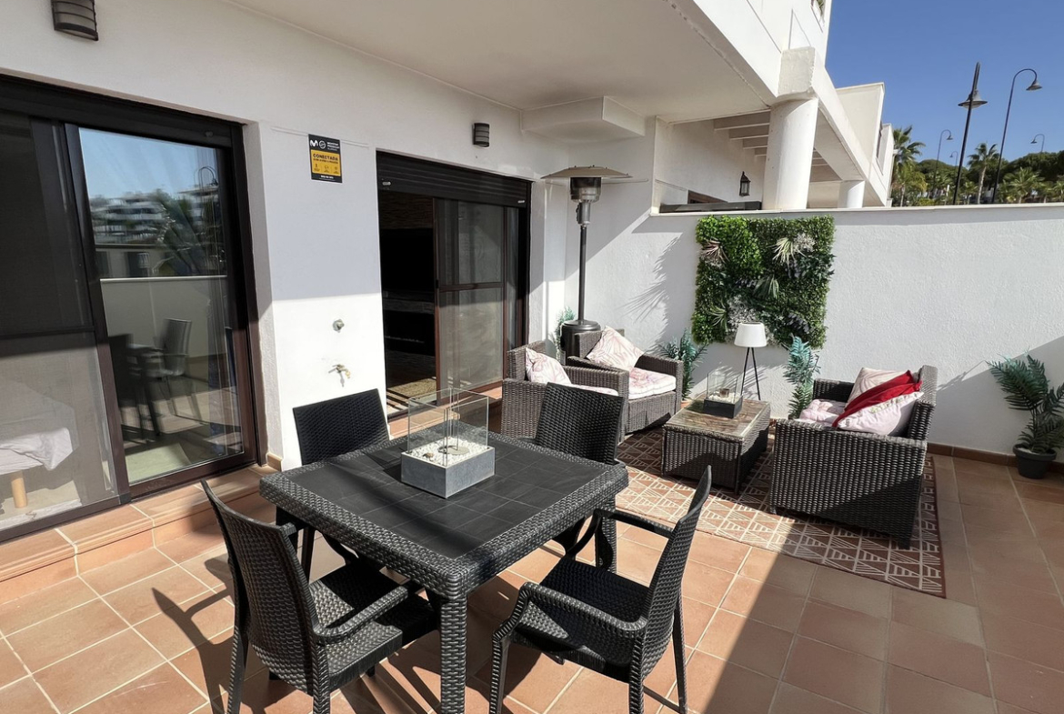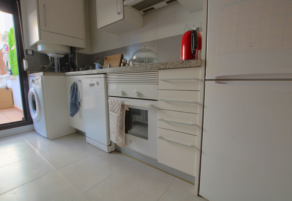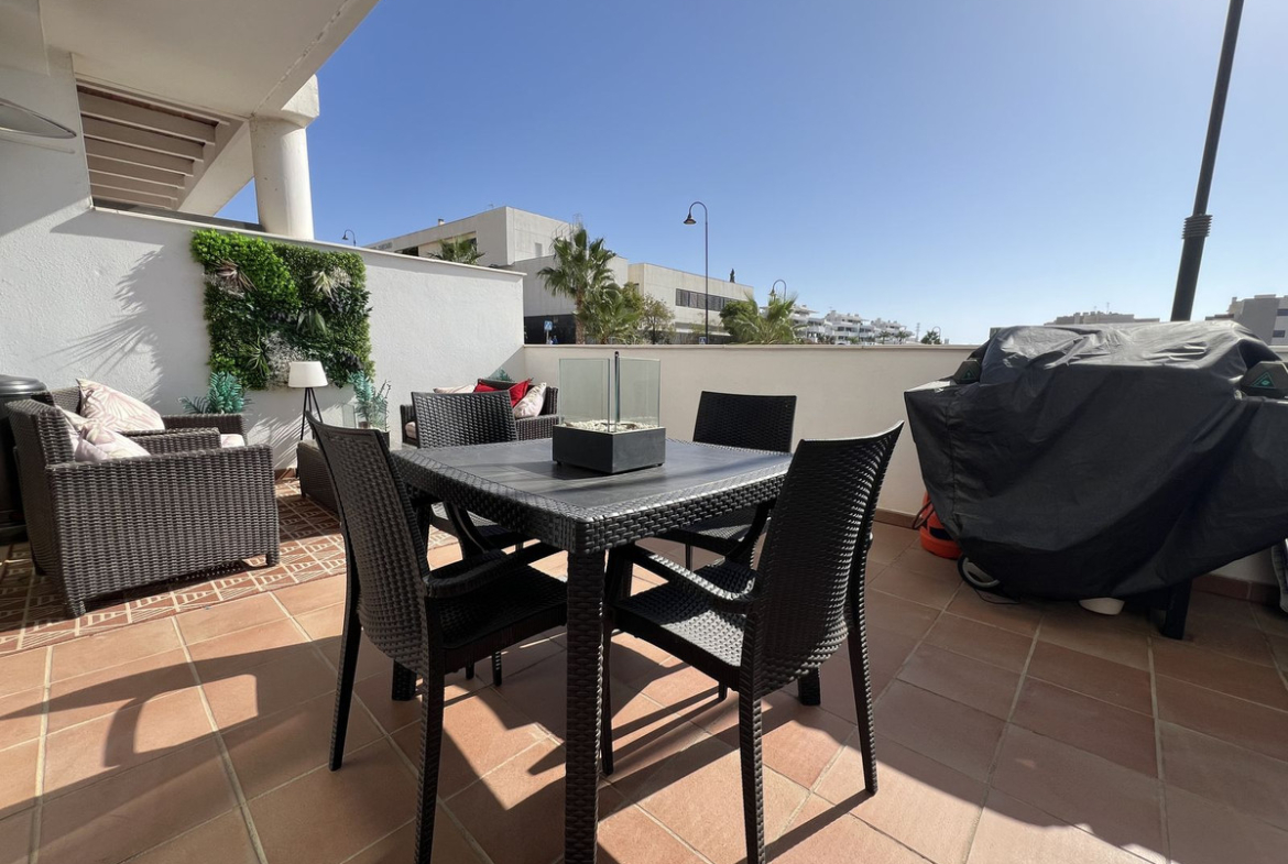 Come and take a look at this superb value property in the La Noria area of La Cala de Mijas. This ground floor modern apartment is ready to use immediately, just bring your swimming gear and a towel. Bright open lounge diner, fully fitted kitchen and two double bedrooms with built-in wardrobes plus hot and cold air conditioning throughout. The main bedroom has a full en-suite bathroom and access to the one of the large partially covered terraces, the guest bedroom has the use of the additional shower room and access to the second large partially covered terrace which also has its own private bar. This property has the huge advantage of having a supermarket on the doorstep and still being only a short walk to the coastal town of La Cala de Mijas, the beach and public transport. Owners also have the use of the beautifully maintained communal swimming pool, an underground parking space, community CCTV, the 2 large terraces mean you can chase the sun or shade plus very reasonable running costs make this is a very desirable choice.
