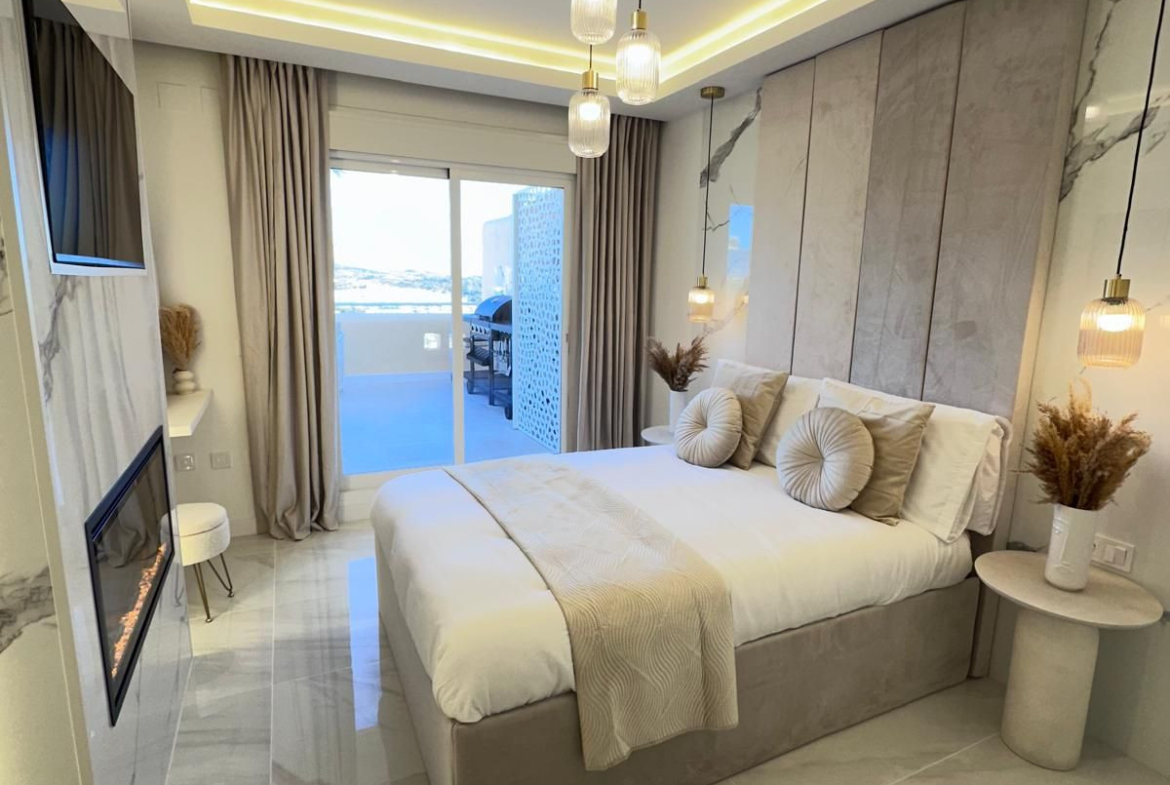 The open-plan living spaces flow seamlessly onto two spacious outdoor terraces, both positioned to maximise the stunning sea and mountain views. One terrace features a bespoke outdoor bar and kitchen, offering a private, resort-style setting perfect for entertaining or relaxing while enjoying the Mediterranean lifestyle.