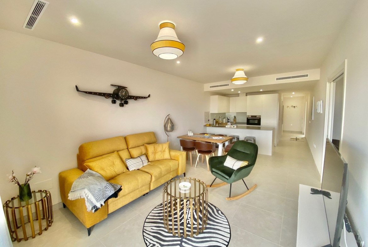 The open-concept kitchen is fully equipped with high-efficiency appliances (Bosch) and an advanced aerothermia climate system, blending sustainability with style. It connects harmoniously to a bright and airy living-dining area, both designed to maximise natural light and indoor-outdoor living. The master suite enjoys direct terrace access and a spa-inspired bathroom with walk-in shower and bathtub, while the second bedroom features fitted wardrobes and its own private terrace. UF heating in both bathrooms adds an extra touch of everyday luxury.