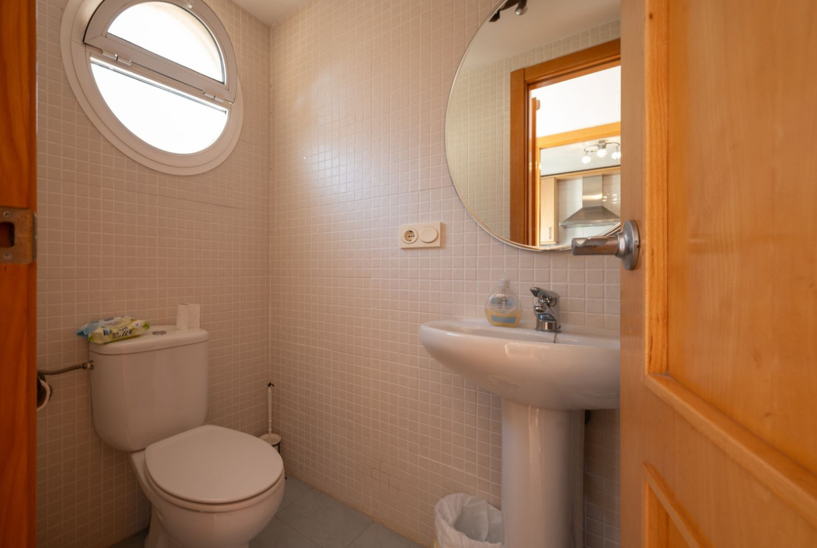 The main floor features a spacious and bright living-dining room with access to a private terrace leading up to the solarium, a fully equipped modern kitchen, and a guest toilet. The lower level comprises two double bedrooms and two full bathrooms, one of them en suite.