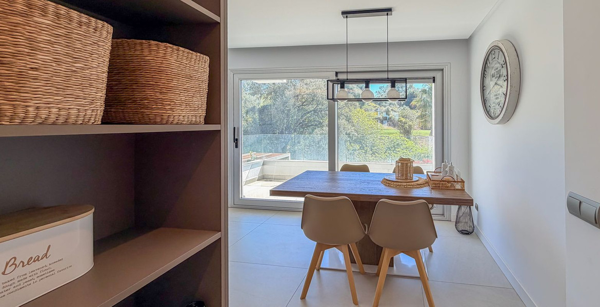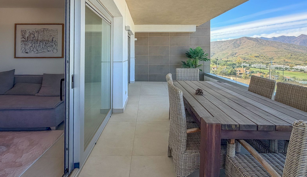 The apartment is bright and generously sized, designed to maximise natural light with large windows and open living spaces. It features two large terraces with different orientations (south and east-west), ensuring sun all day long and allowing you to enjoy truly panoramic views of Sierra de Mijas mountains, and even the sea, the other terrace has garden, pool and views over the golf course.