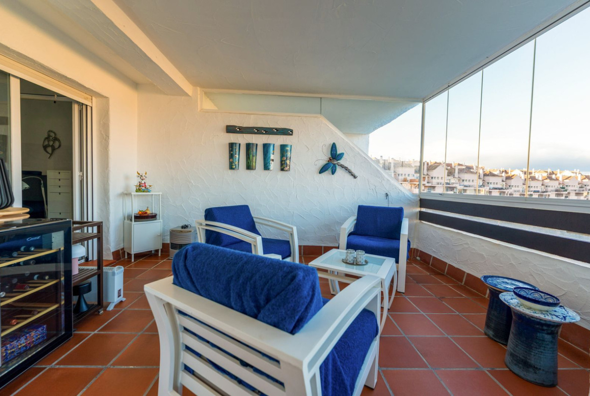 From the main terrace, you can enjoy views of the communal swimming pool and landscaped gardens, while the front terrace, accessible from the bright living room and the master bedroom, has been enclosed with Lumon glass curtains. This additional space creates a perfect area for reading, dining, or simply enjoying the panoramic views of La Duquesa Golf Course, the surrounding mountains, and the peaceful Andalusian countryside.